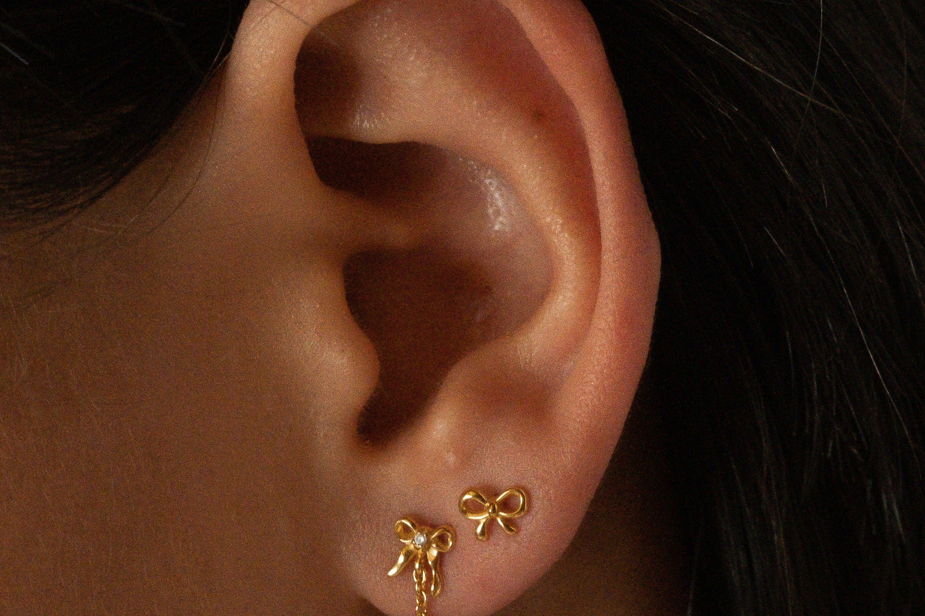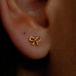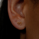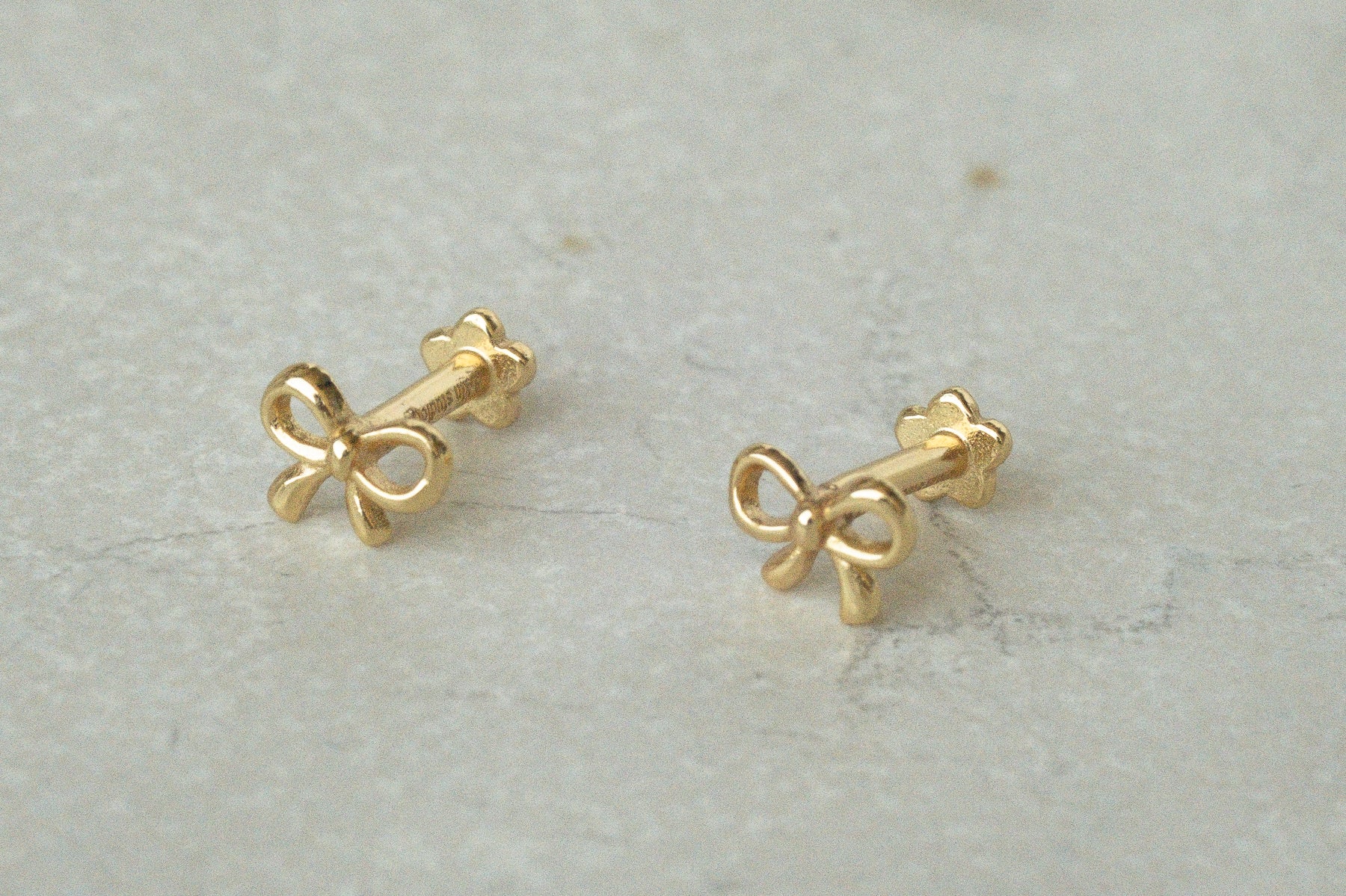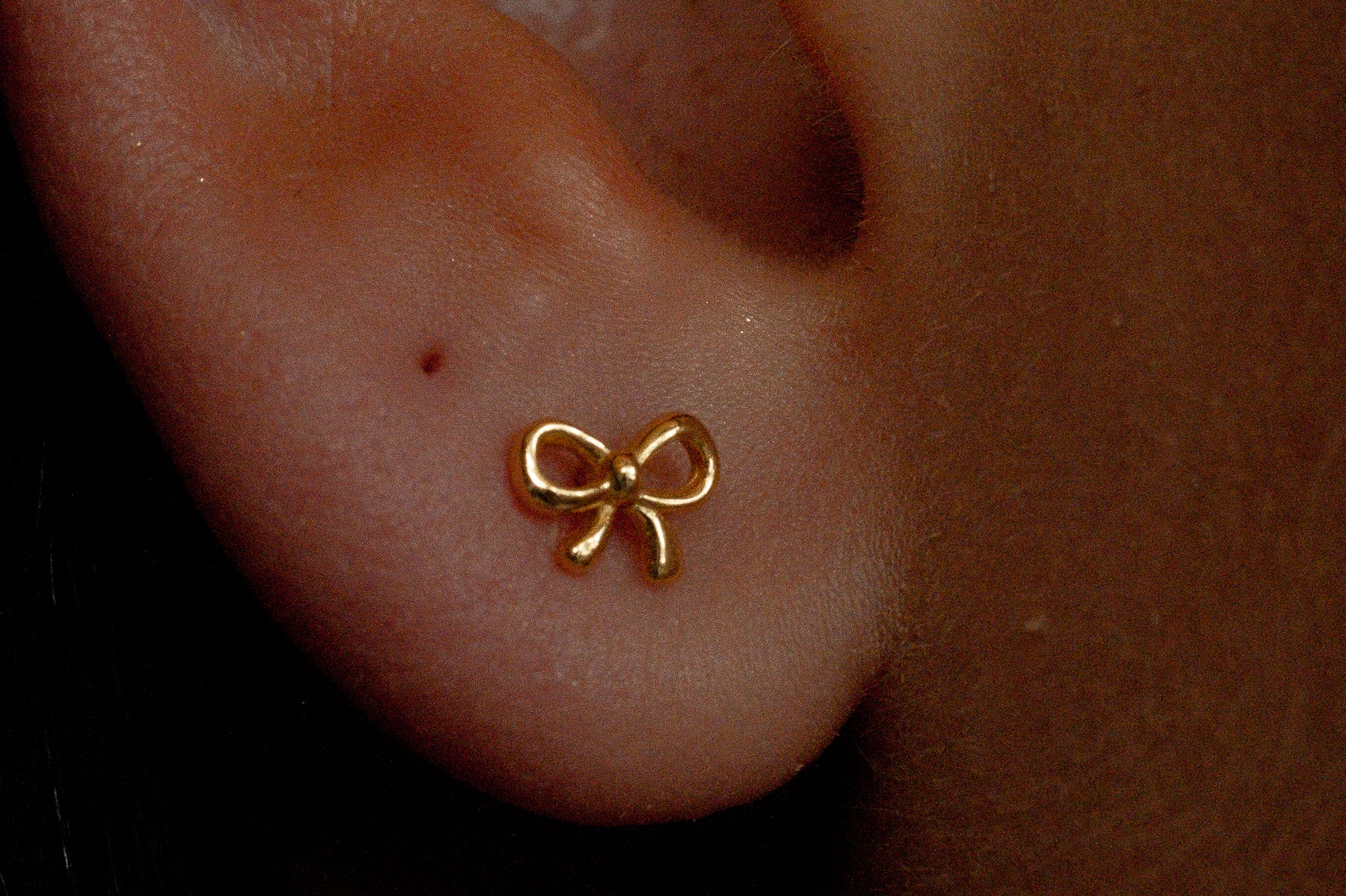 Add a touch of playful elegance to your look with our 14K Solid Gold Mini Bow Piercing Stud. The dainty bow feature adds a charming detail, while the flatback and screw in design make it comfortable to wear. Made with hypoallergenic 14k solid gold, it's safe for even the most sensitive skin.