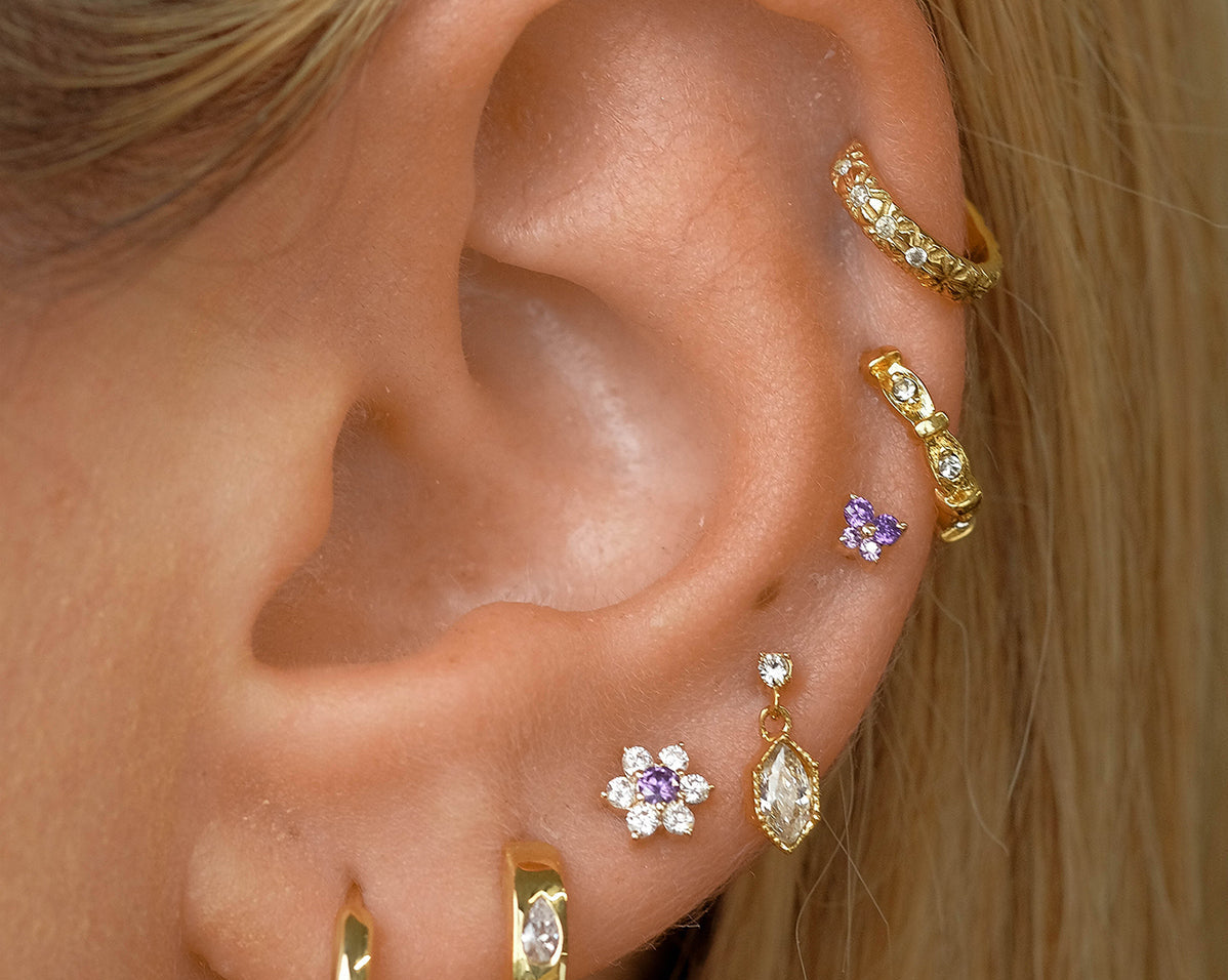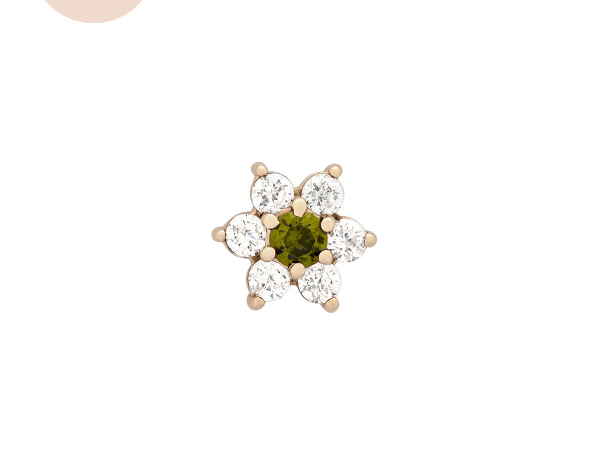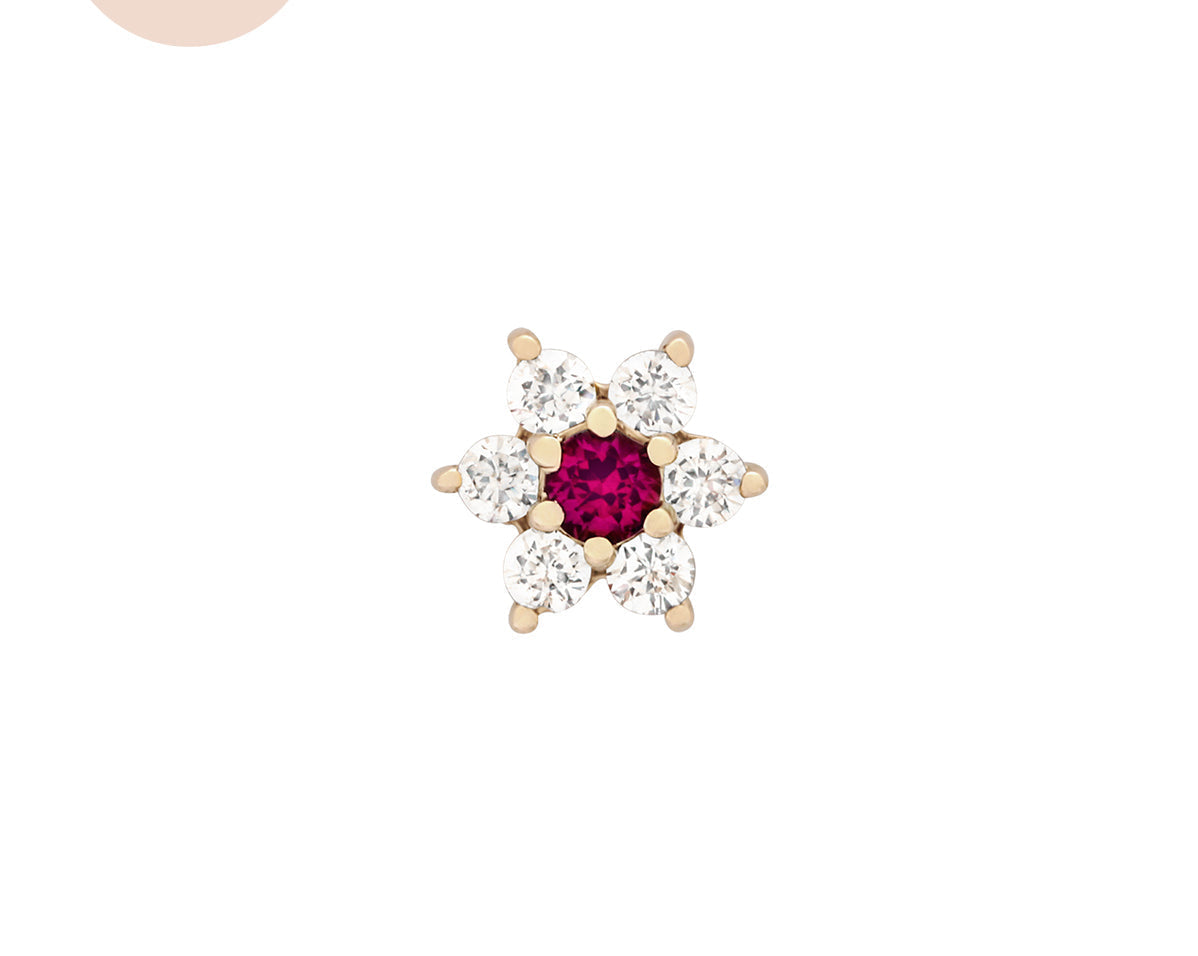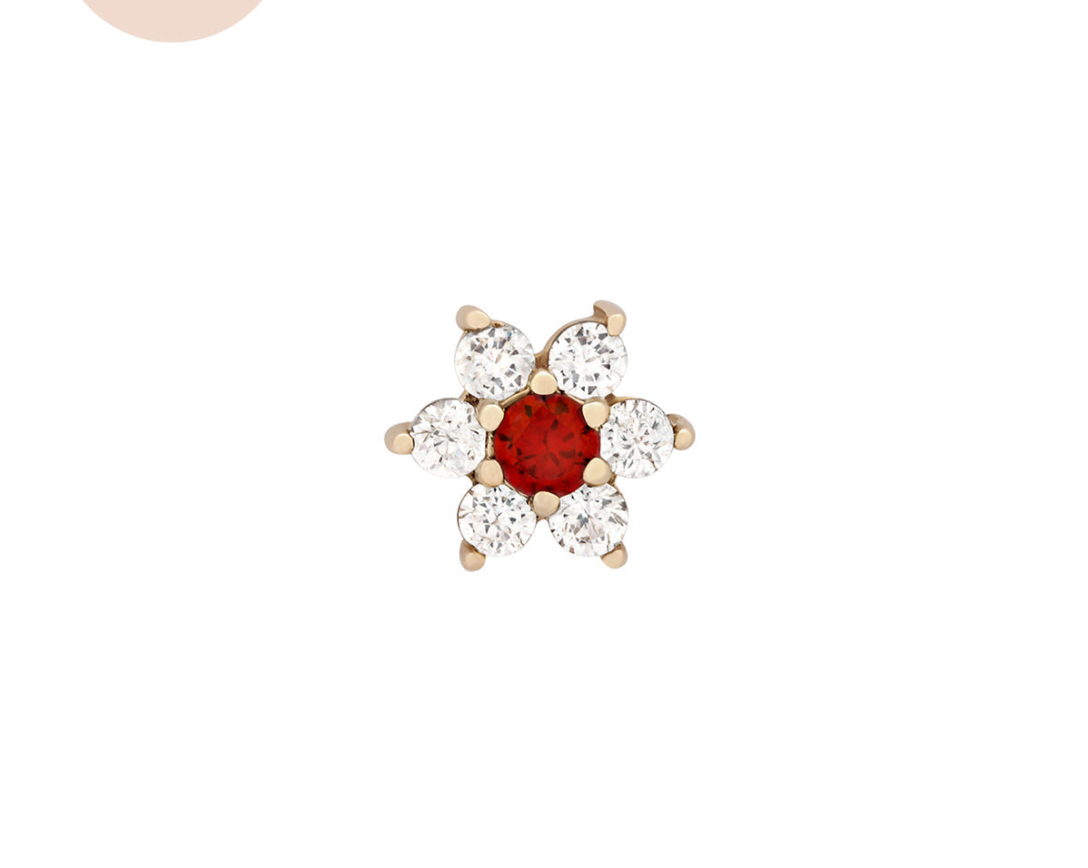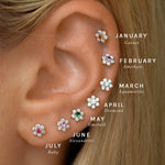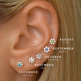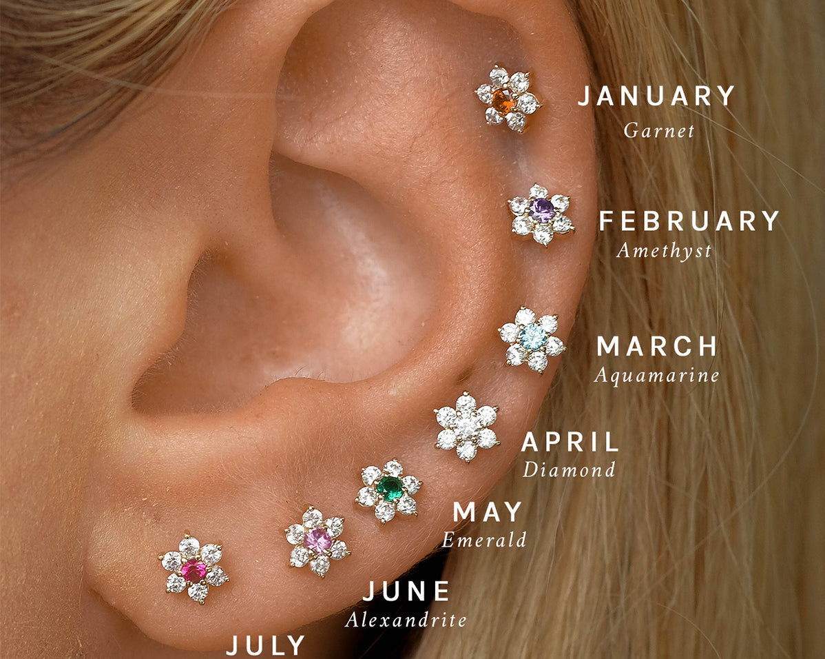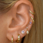 Featuring six glistening petals dotted by an eye-catching birthstone, Ren is the perfect personalised addition to your curated ear stack. Fit with a ball back, Ren can always be worn comfortably in your lobe, forward helix, helix, conch, flat or tragus piercings.