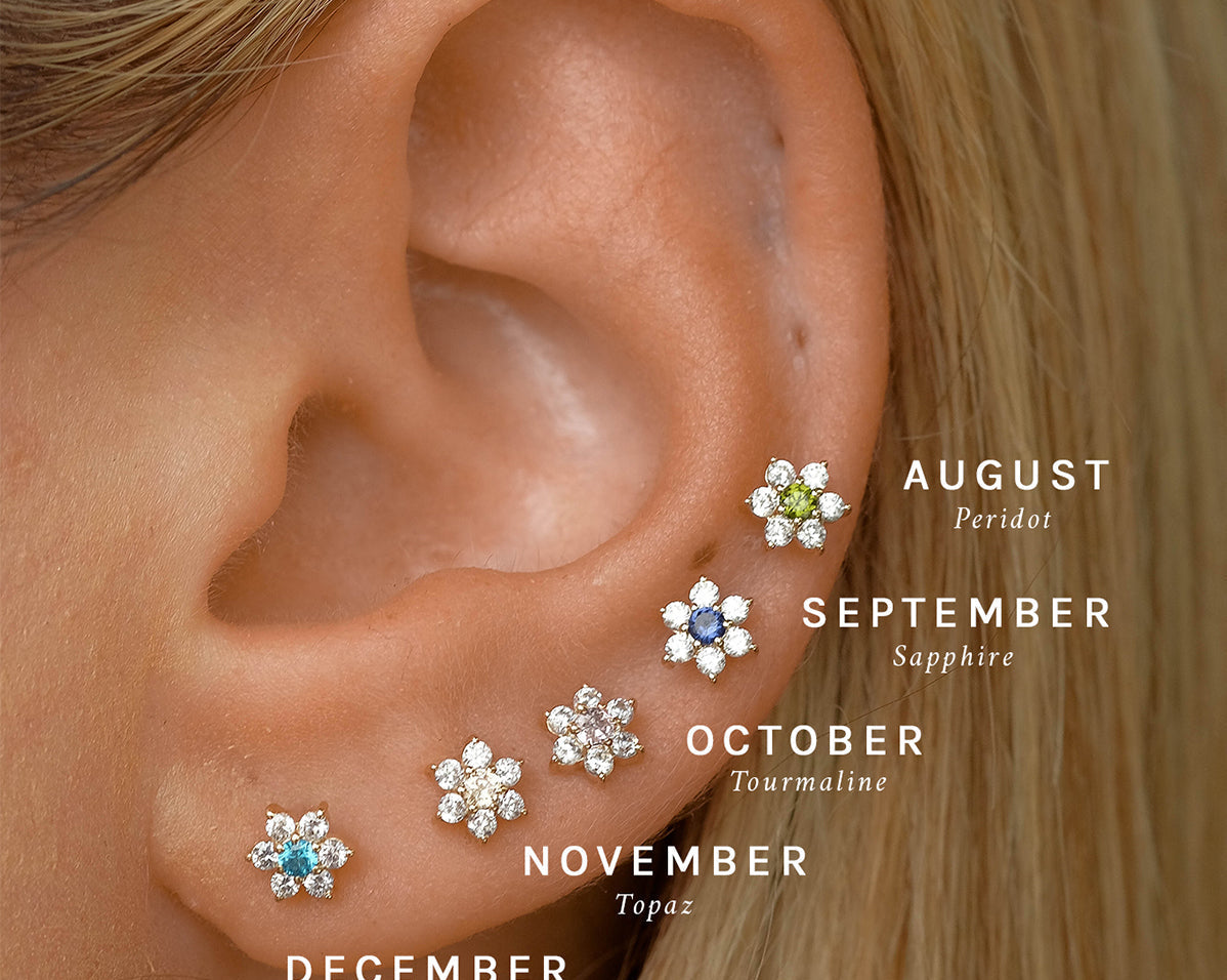 Inspired by the birthstones of each month, we created the Birthstone Piercing Collection as a way to add a hint of colour to your ear stack in a way that is both personalised and unique. A stunning addition to your 14K Solid Gold or Gold Fill jewelry selection, the Ren Lotus Stud and the Cho Butterfly Stud makes beautiful gifts for birthdays, anniversaries and other milestone occasions.