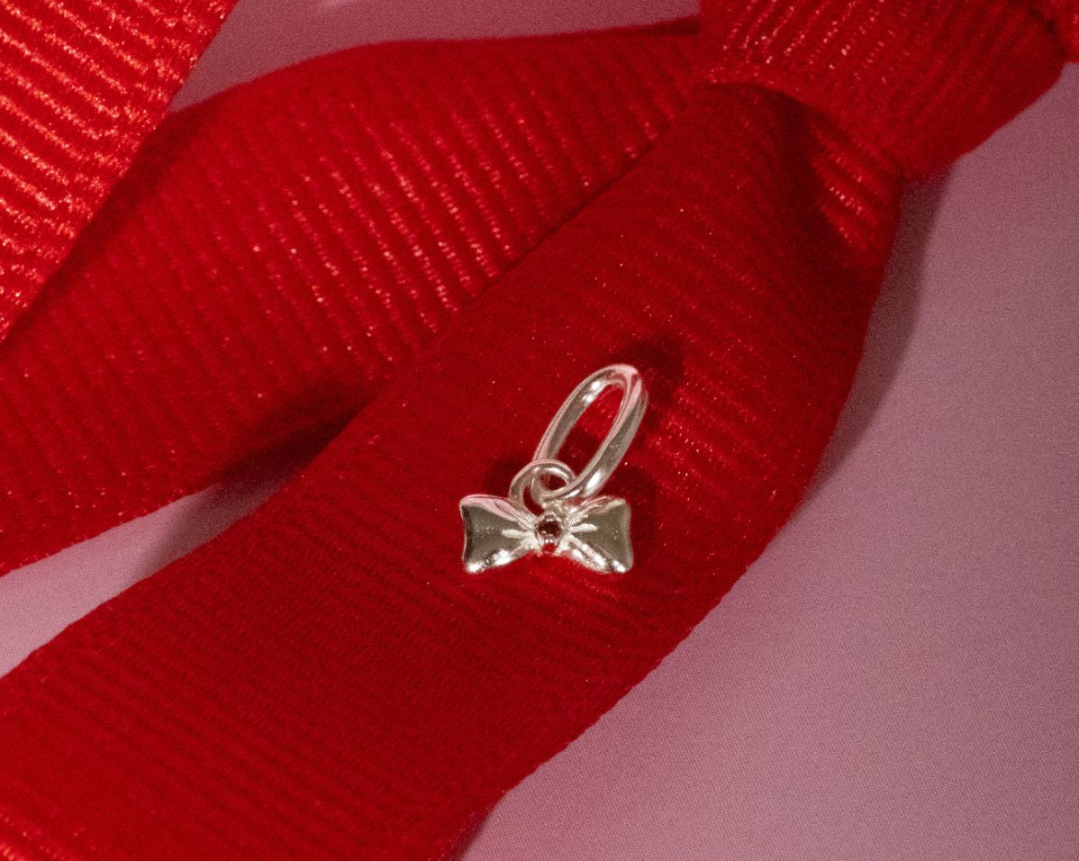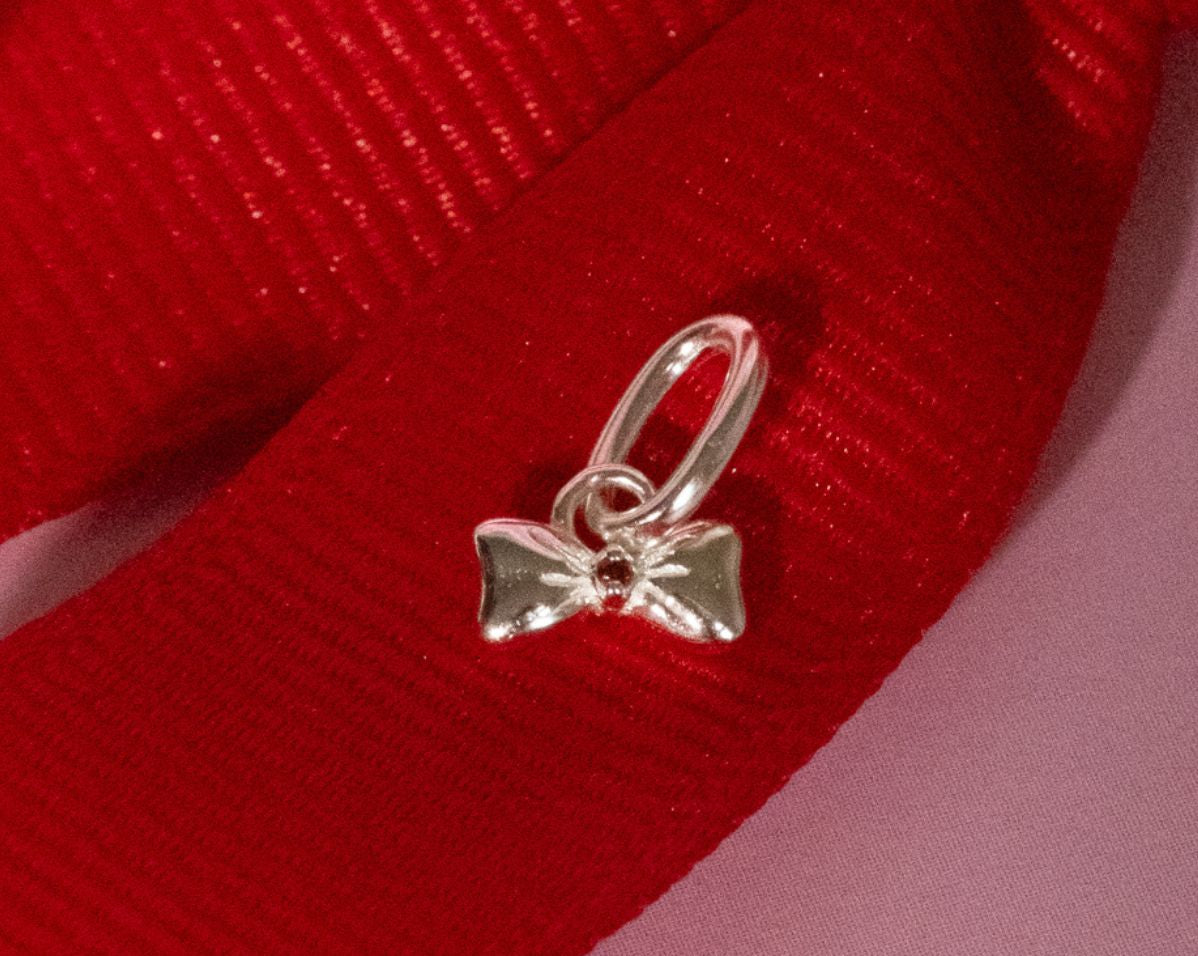 - Red cz gemstone in the center of a puffy bow, resembling Kiki's own