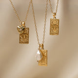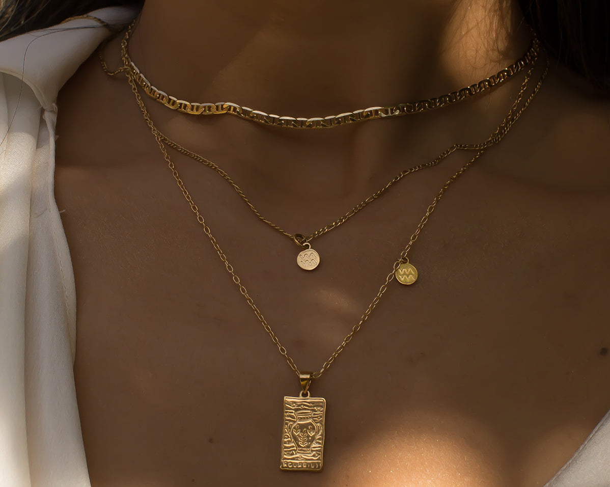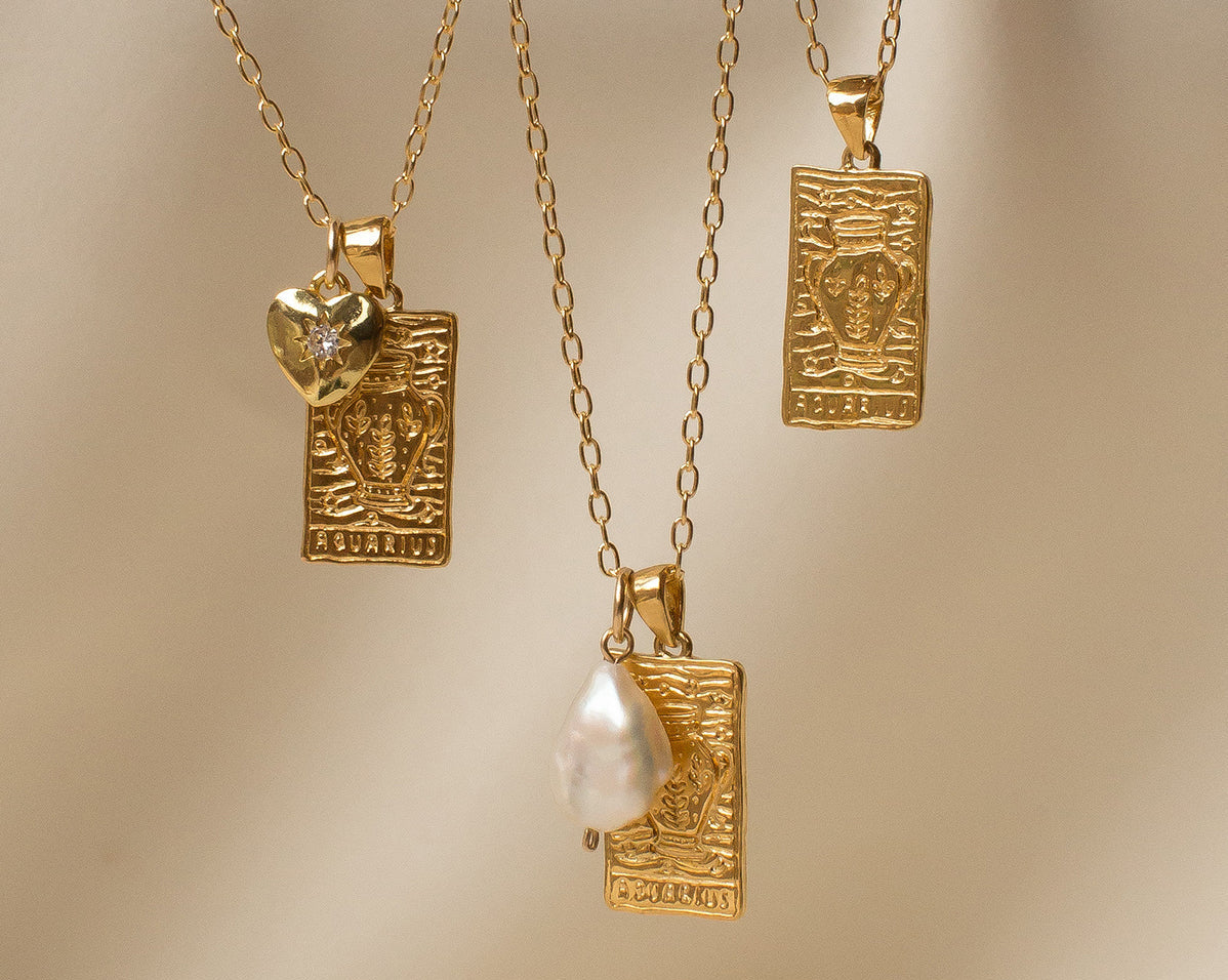 The collection features 12 pendant necklaces with a double-sided tarot-inspired star sign pendant, and a customizable mini star sign charm. Inspired by tarot cards, and the magical world of astrology, the 12 necklaces are customizable with two signs – sun and moon signs – or those with signs on the cusp.