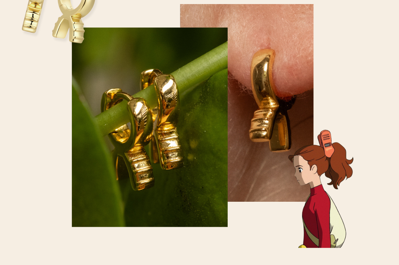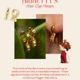 Inspired by the world of the Borrowers, on how something so small could turn into a wearable treasure. These hoops represent Arrietty’s signature clip and her adventures in a world so much bigger than she is.