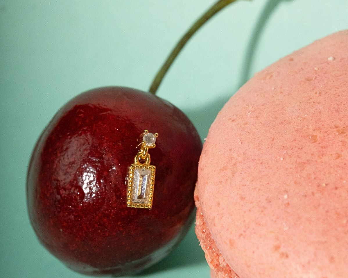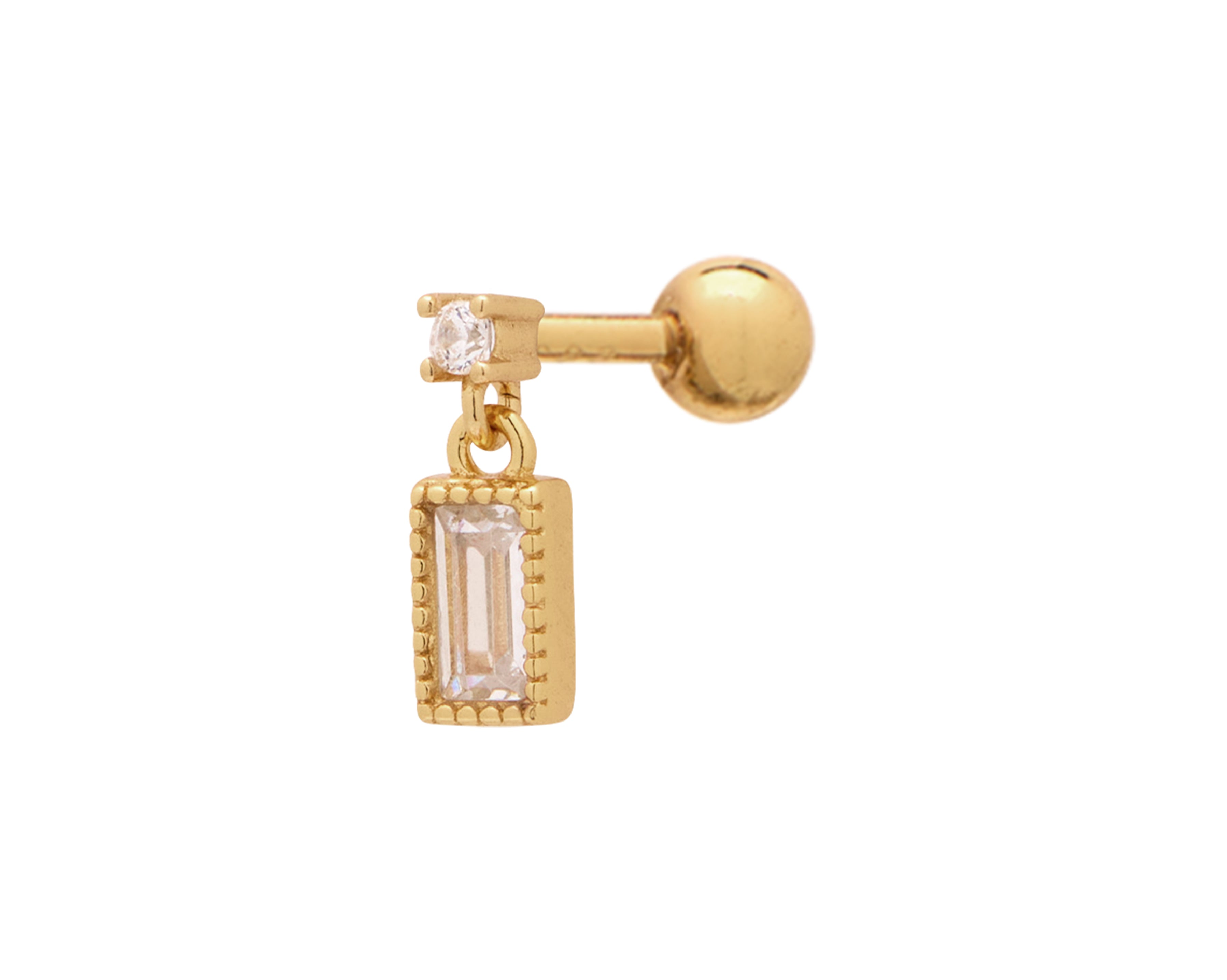 This stud features a small baguette-shaped dangle, designed to sit comfortably on the earlobe, helix, and flat piercings. The ball back keeps it securely in place for easy wear.