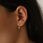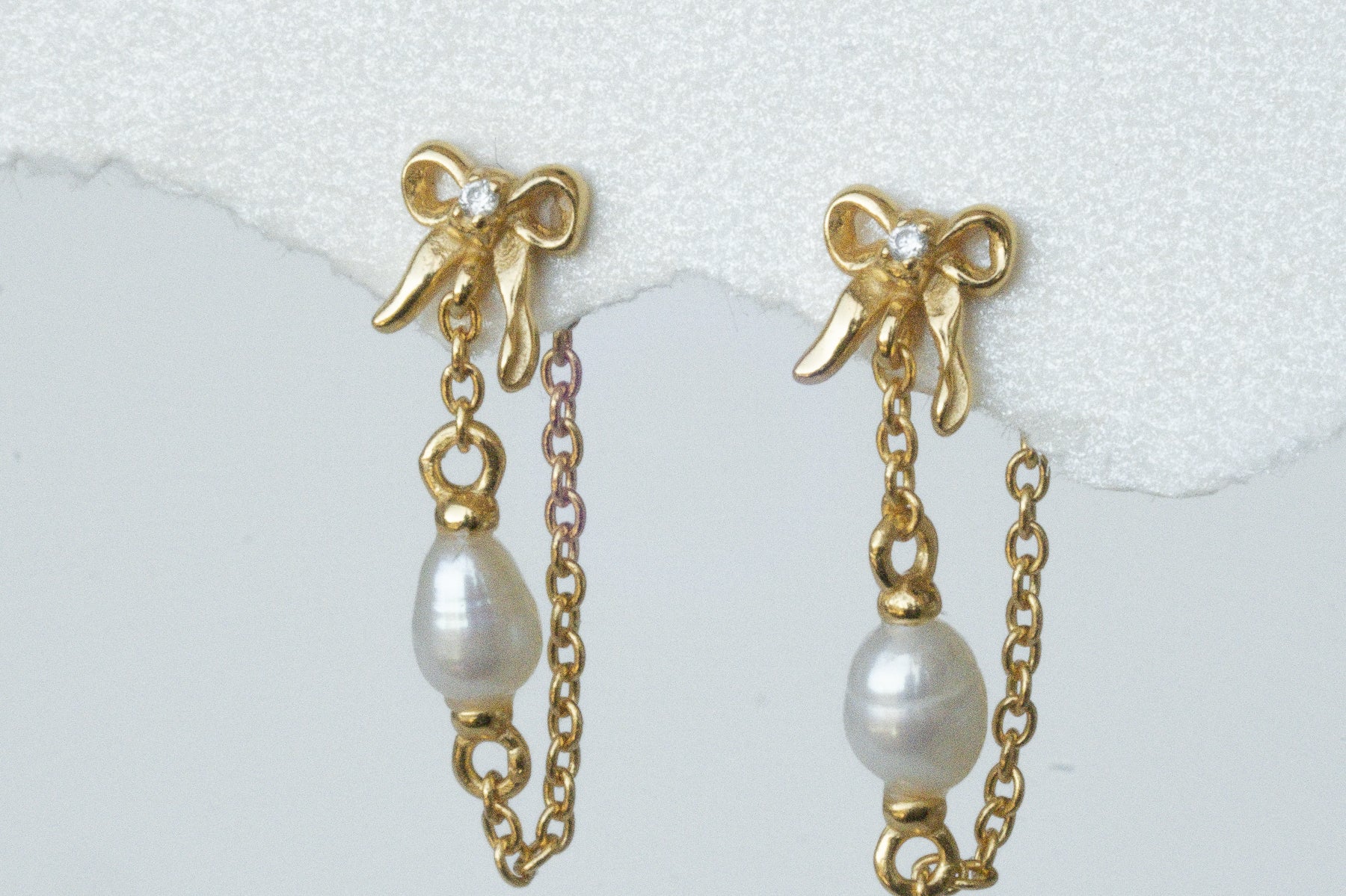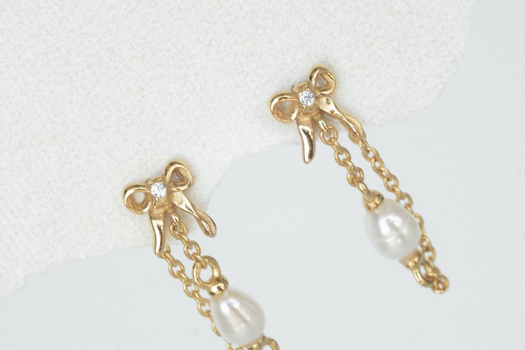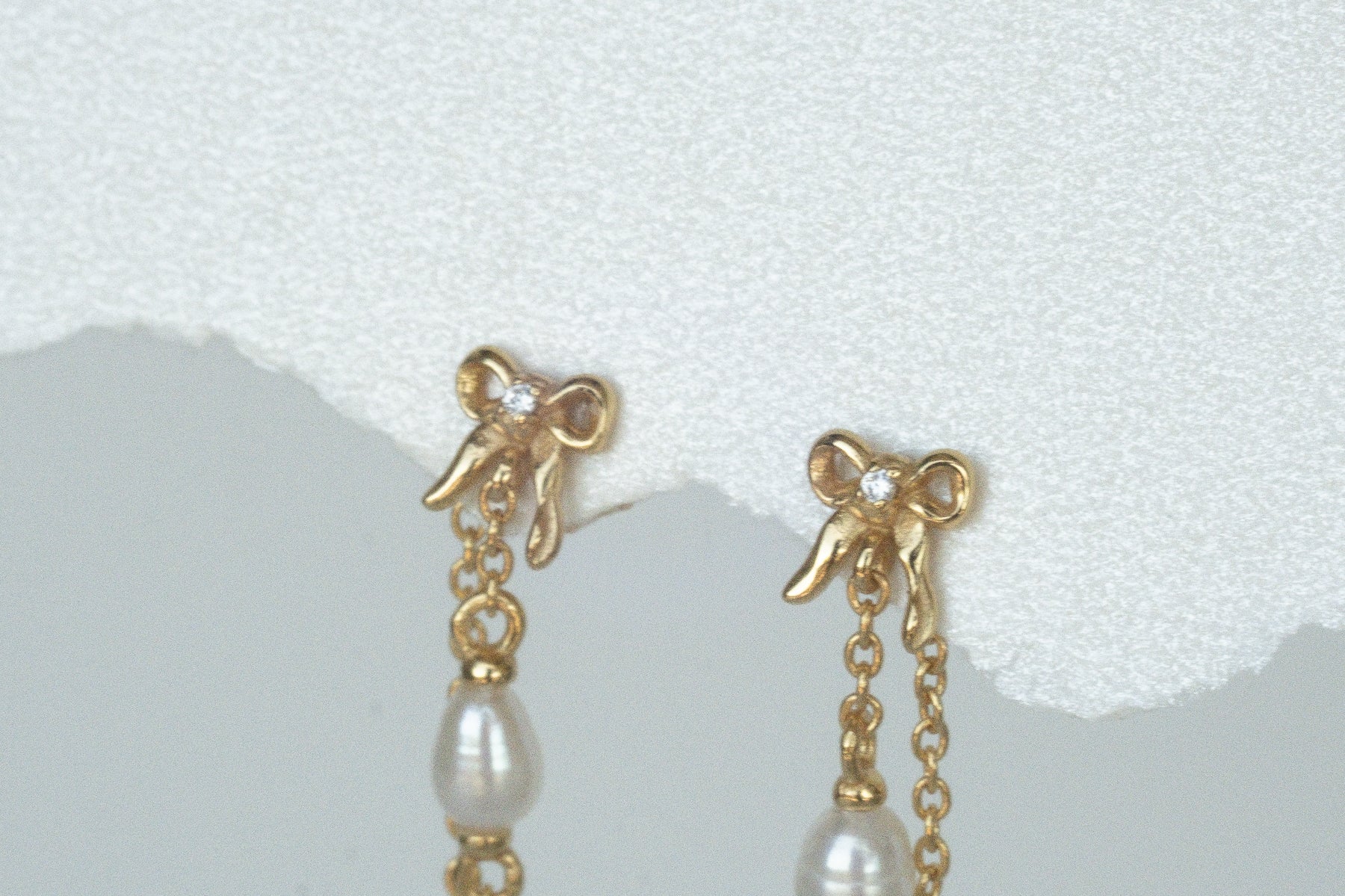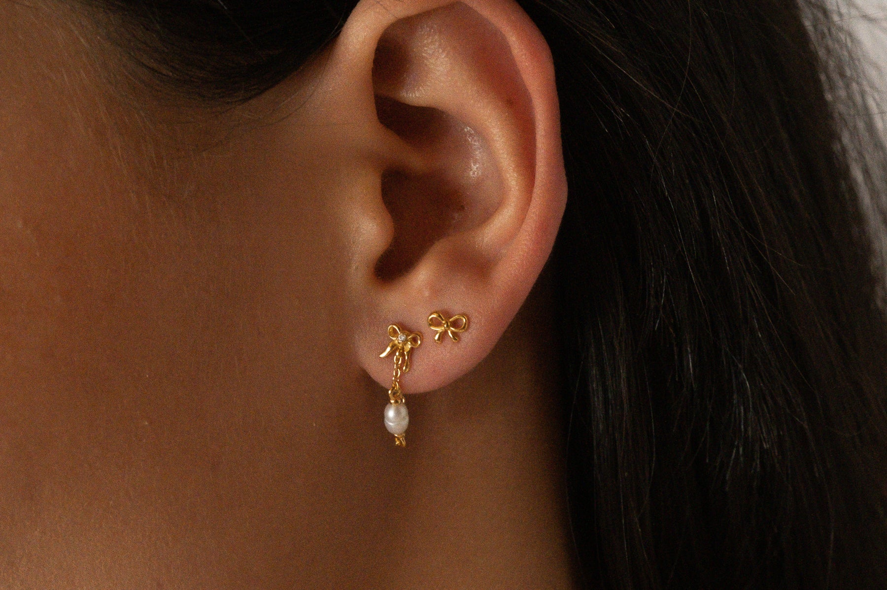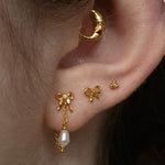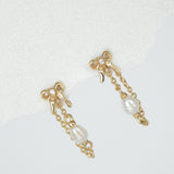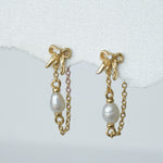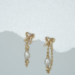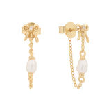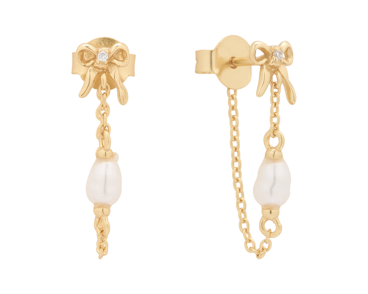 Inspired by our original Delia stud, the Bow Pearl Drop Stud is an elegant chain dangle earring that loops around the ear for a unique and dainty finish. This earring features a butterfly back, a tiny 3D bow and a petite pearl.