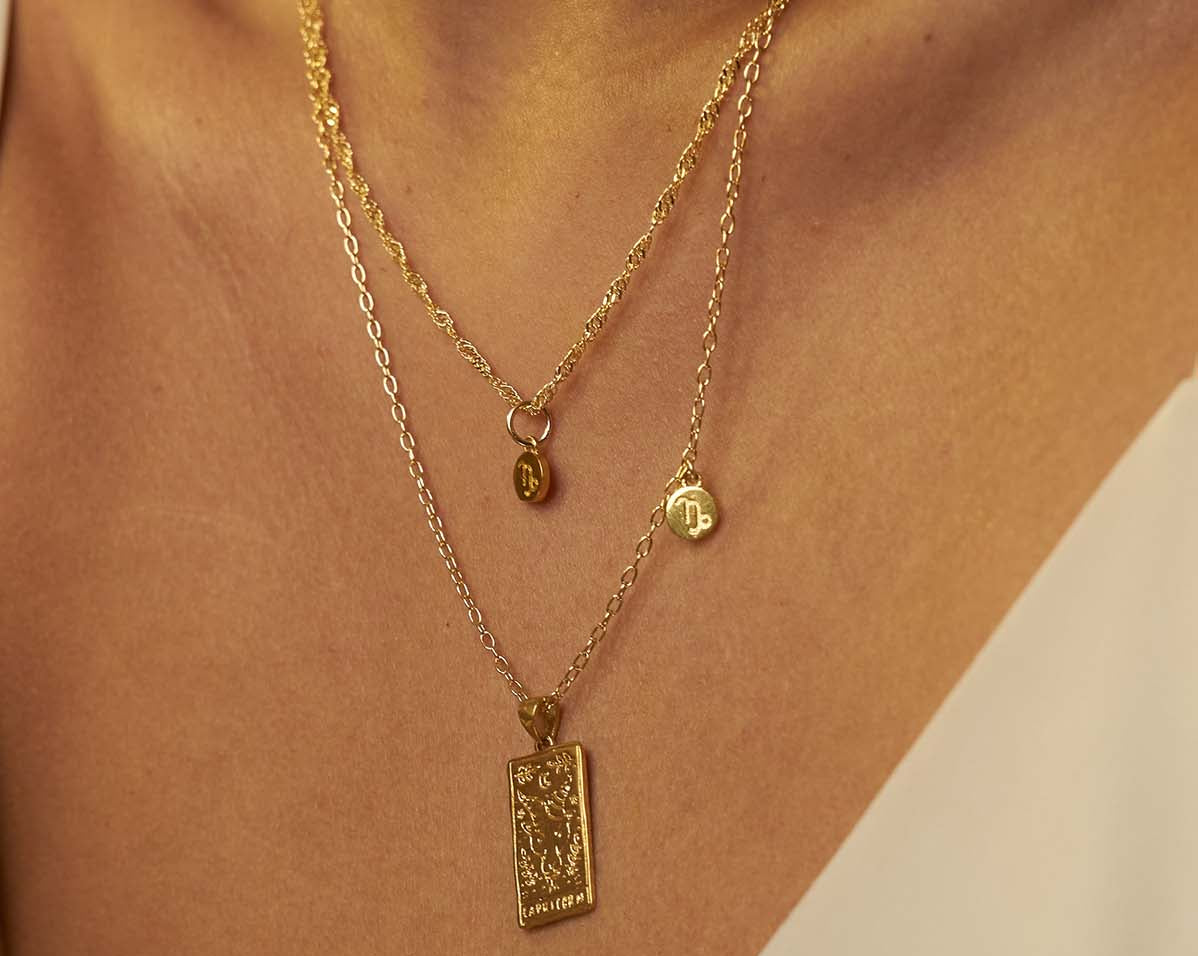 The collection features 12 pendant necklaces with a double-sided tarot-inspired star sign pendant, and a customizable mini star sign charm. Inspired by tarot cards, and the magical world of astrology, the 12 necklaces are customizable with two signs – sun and moon signs – or those with signs on the cusp.