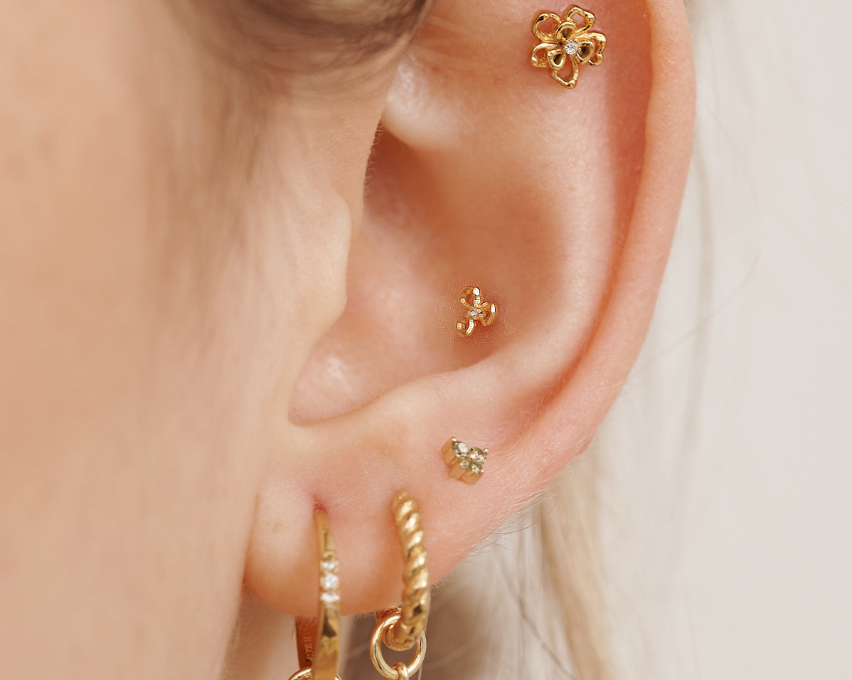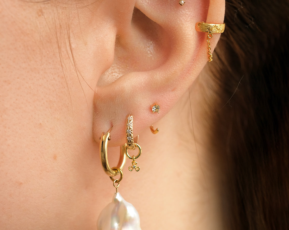 Inspired by the desire to have beautiful and high quality earrings for all our ear piercings, the Piercing Collection is suitable for fresh and healed piercings. With lobe friendly hoops and helix friendly ball back studs, the Piercing Collection can cater for fresh and healing piercings with our 14k solid gold earrings whilst our classic 18k gold fill earrings can be worn in all healed ear piercings. Made ethically in our factories in Mumbai, India, each Piercing Collection piece has been carefully crafted by our artisans just for you.