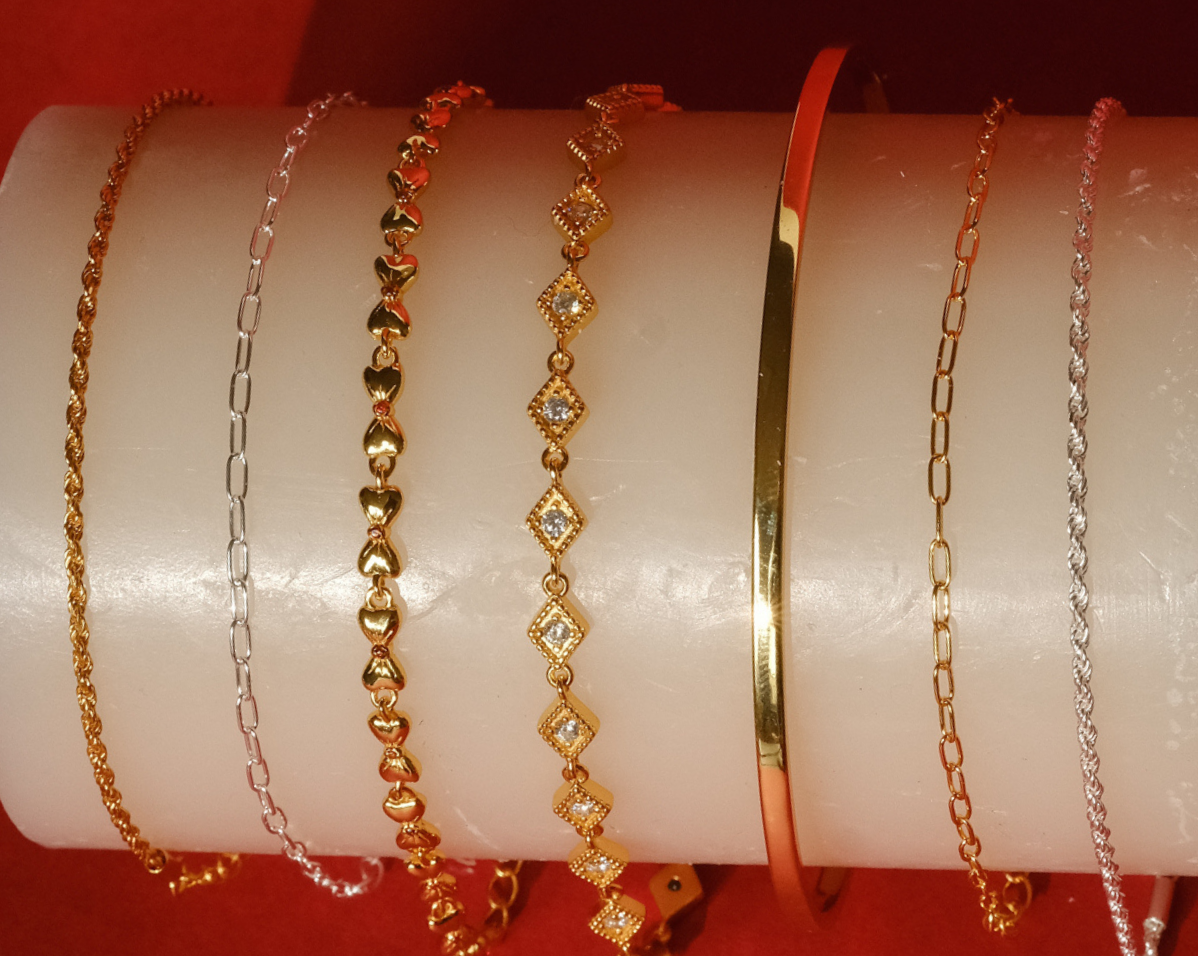 With any type of jewelry, even solid gold and solid silver, regular cleaning and upkeep is needed to keep your jewelry in its best condition. Simply use warm water and soap or a polishing cloth to clean. You can use our jewelry in water, however do wipe it down with warm water after you’re done, especially after being submerged in salt water. Sweat can also make your jewelry duller quicker, especially necklaces, so remove these when you are working out. Avoid exposing your jewelry to skin care products, soaps, detergents and perfumes. Store your jewelry in your S-kin Studio pouch or box to avoid moisture and metal on metal rubbing.
