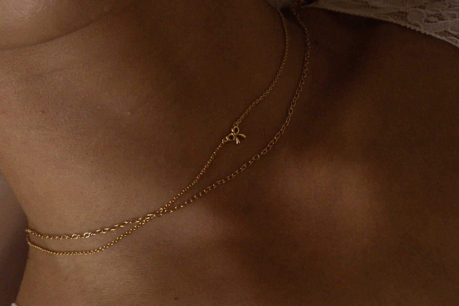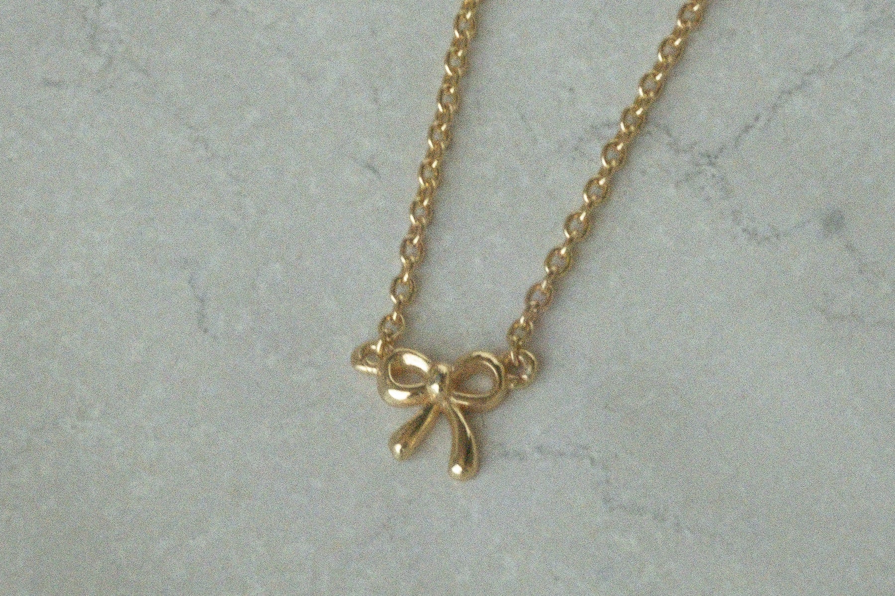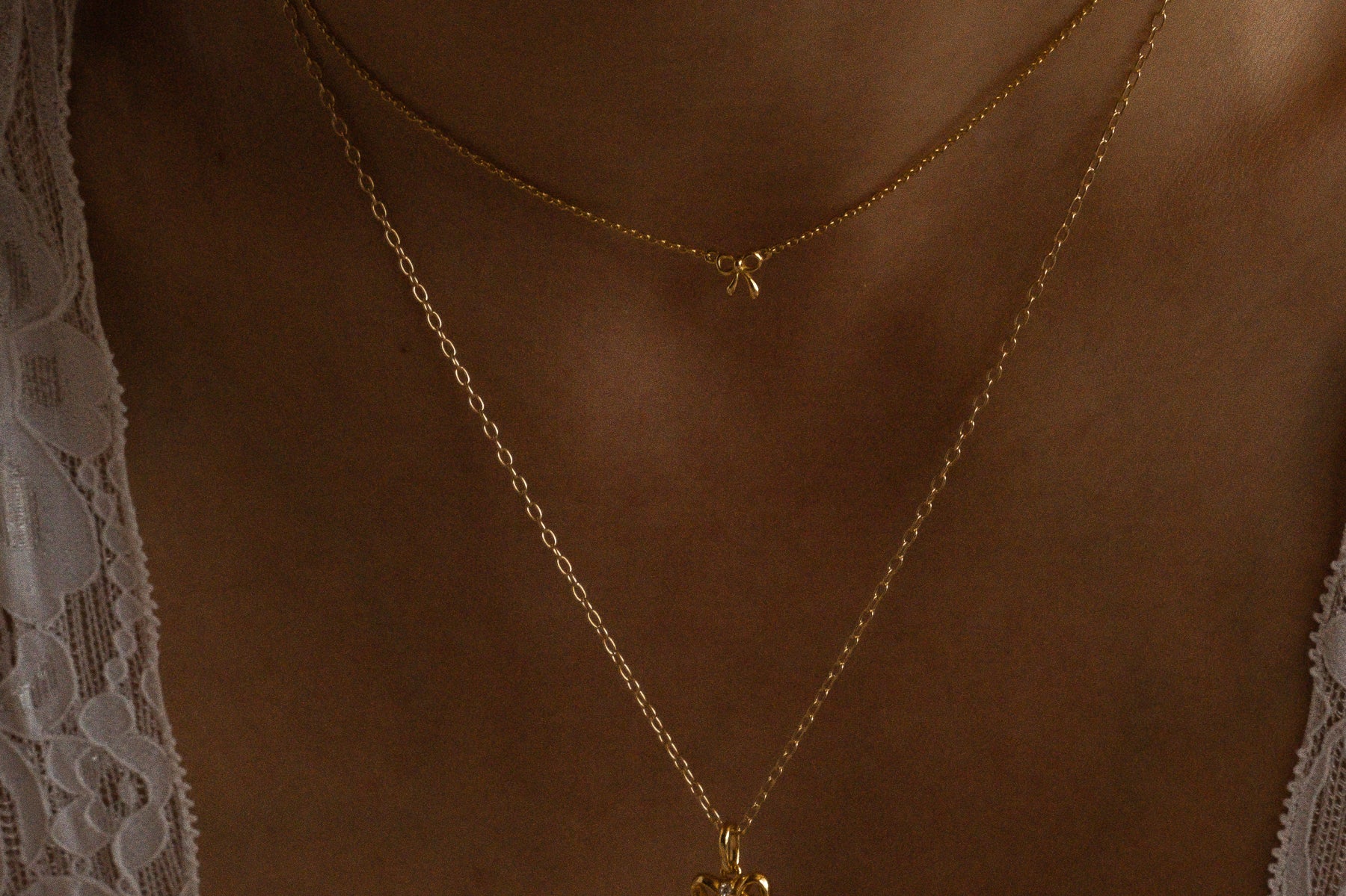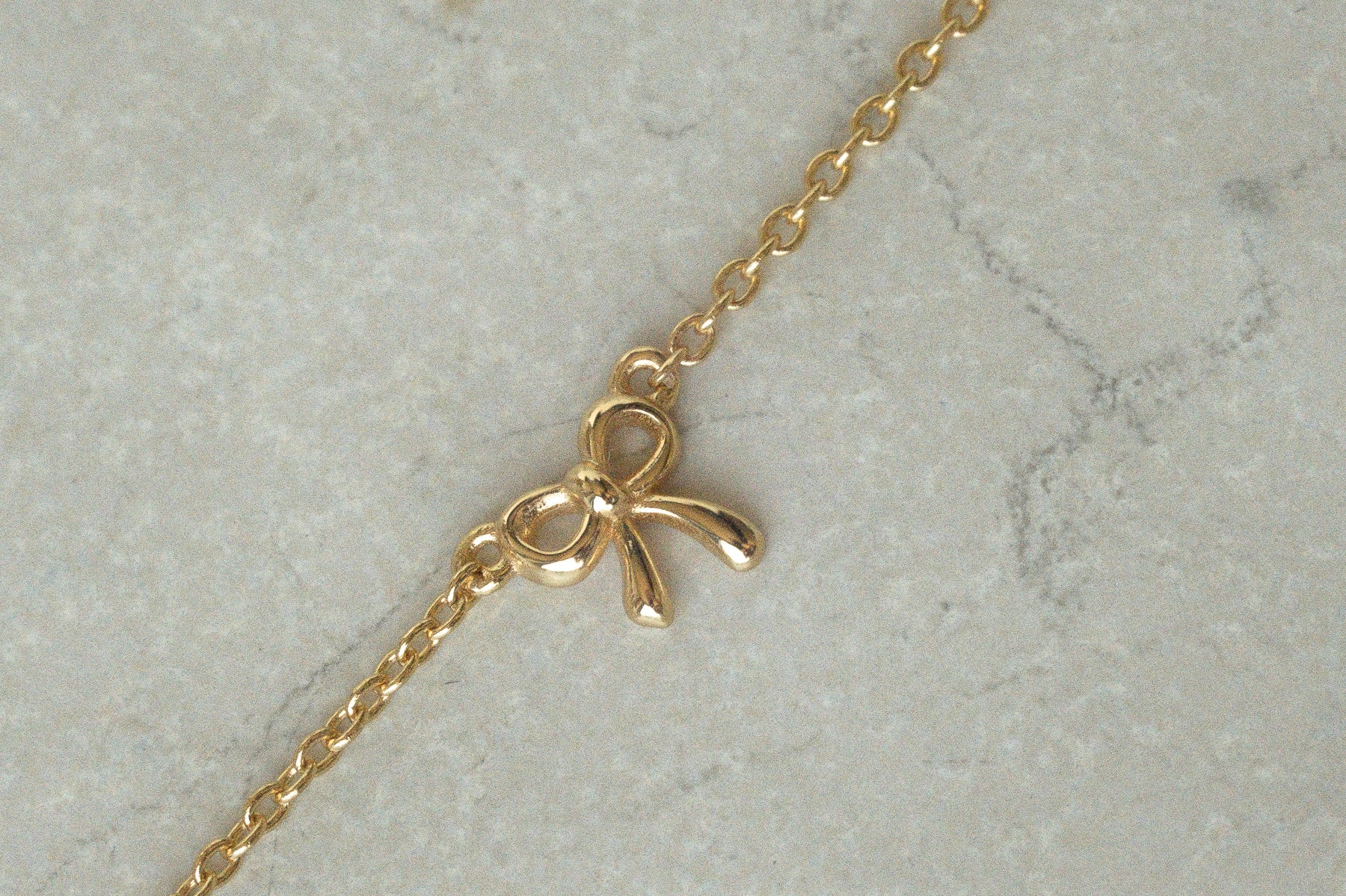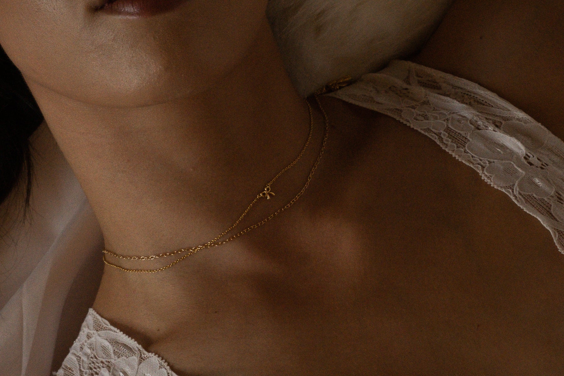 Add a touch of elegance to any outfit with our Dainty Bow Choker Necklace. The delicate chain and tiny bow create a timeless look that falls perfectly in the middle of your decolletage. Made with 18K Gold Fill, it's safe to wear in the shower and won't tarnish. (No more jewellery removal struggles!)