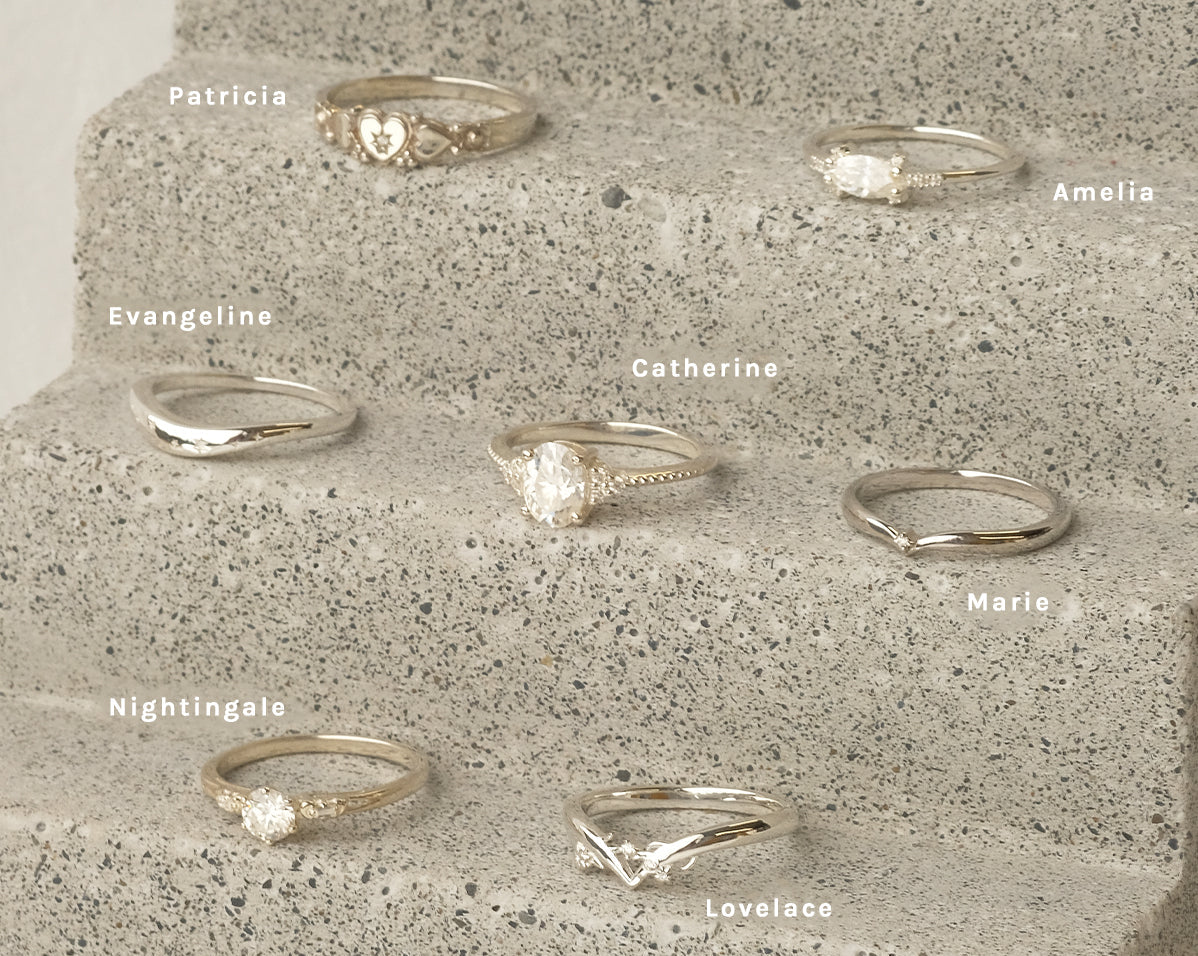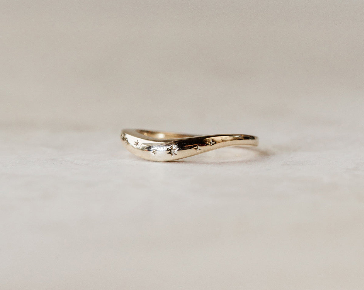 Inspired by the American astrologer, Evangeline Adams, this stunning constellation ring is a constant reminder that the stars are the limit. Evangeline was a late 19th to early 20th century astrologer known for writing and defending a number of popular books about astrology. This uniquely curved ring, like the stars to the planets, has been made to allow you to fit your engagement or ceremonial ring neatly on top.