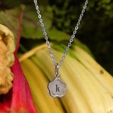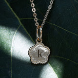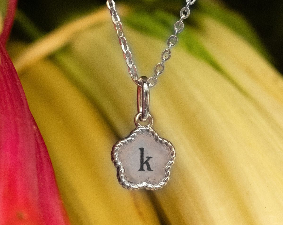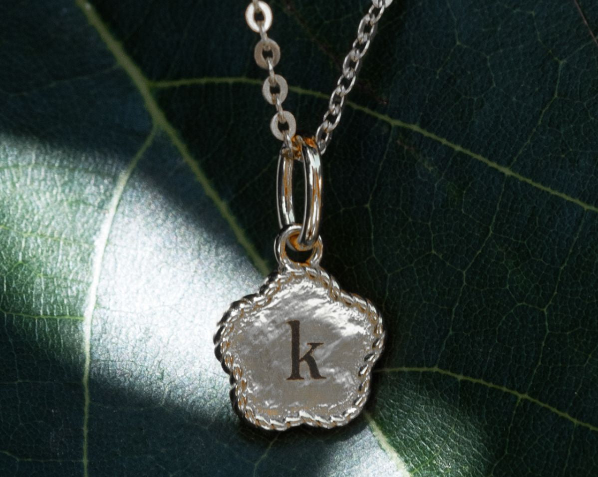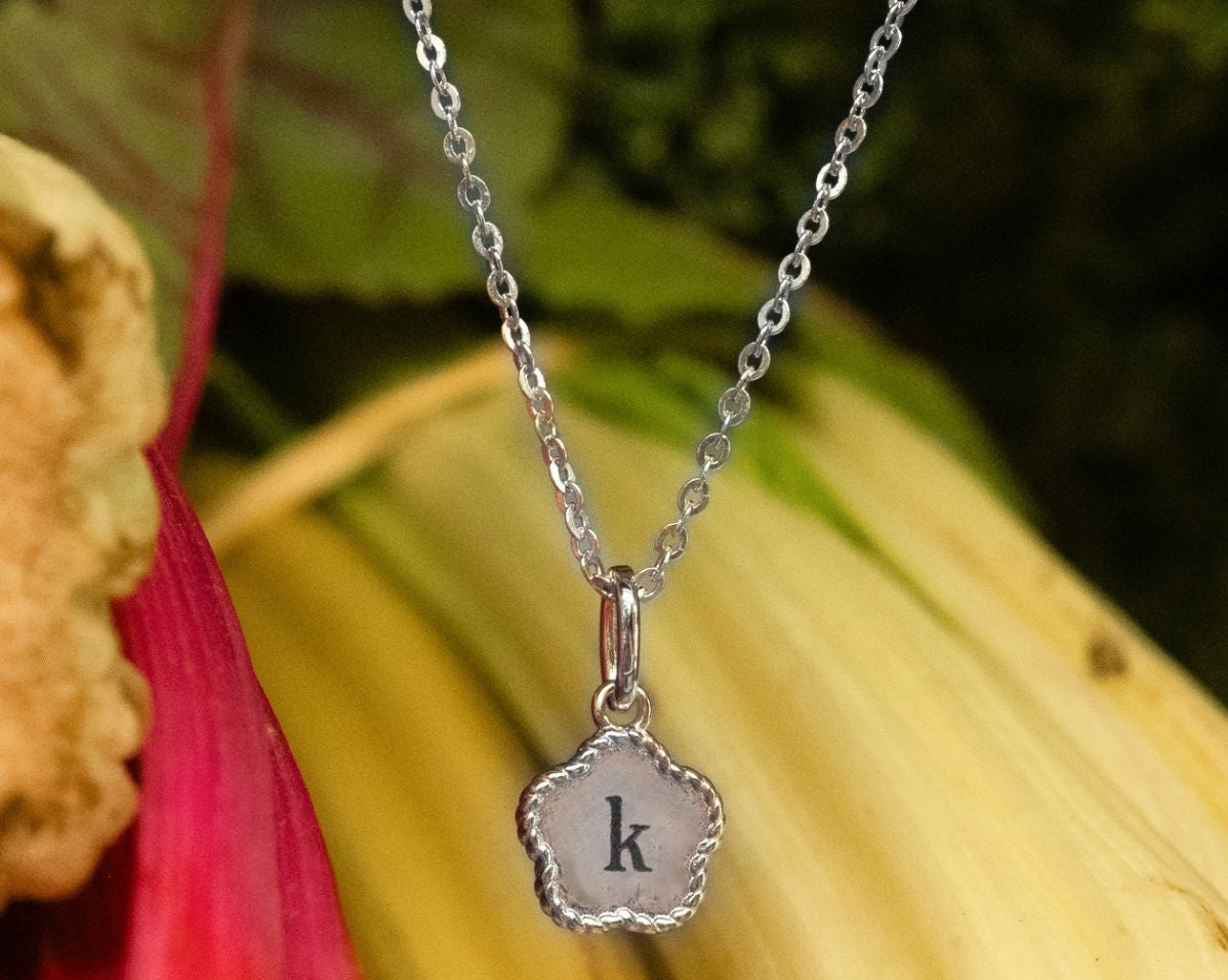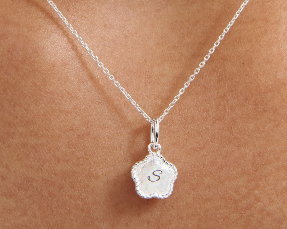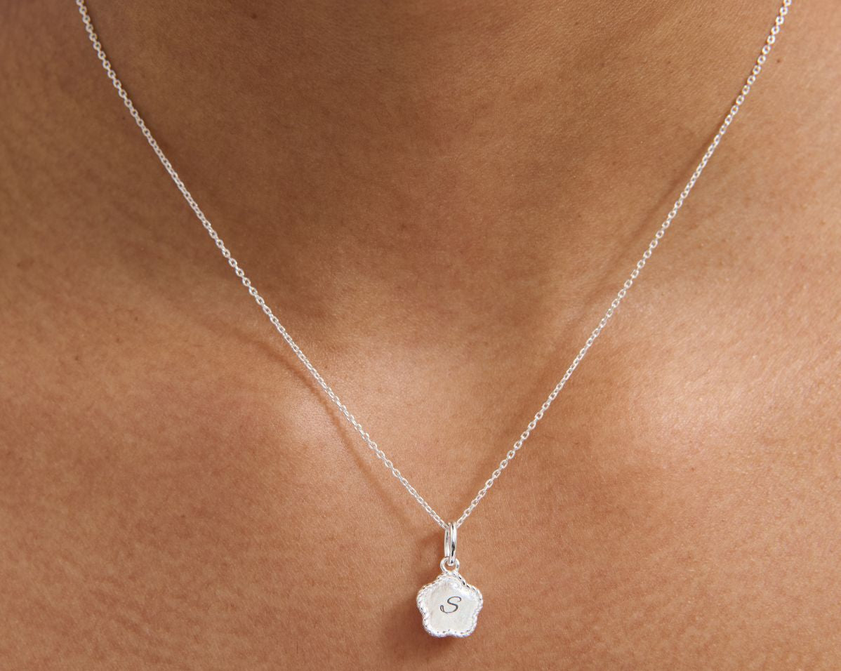 The flower pendant is ready to be engraved with a single initial that holds meaning to you—whether it’s your own, a loved one’s, or someone you want to keep close.