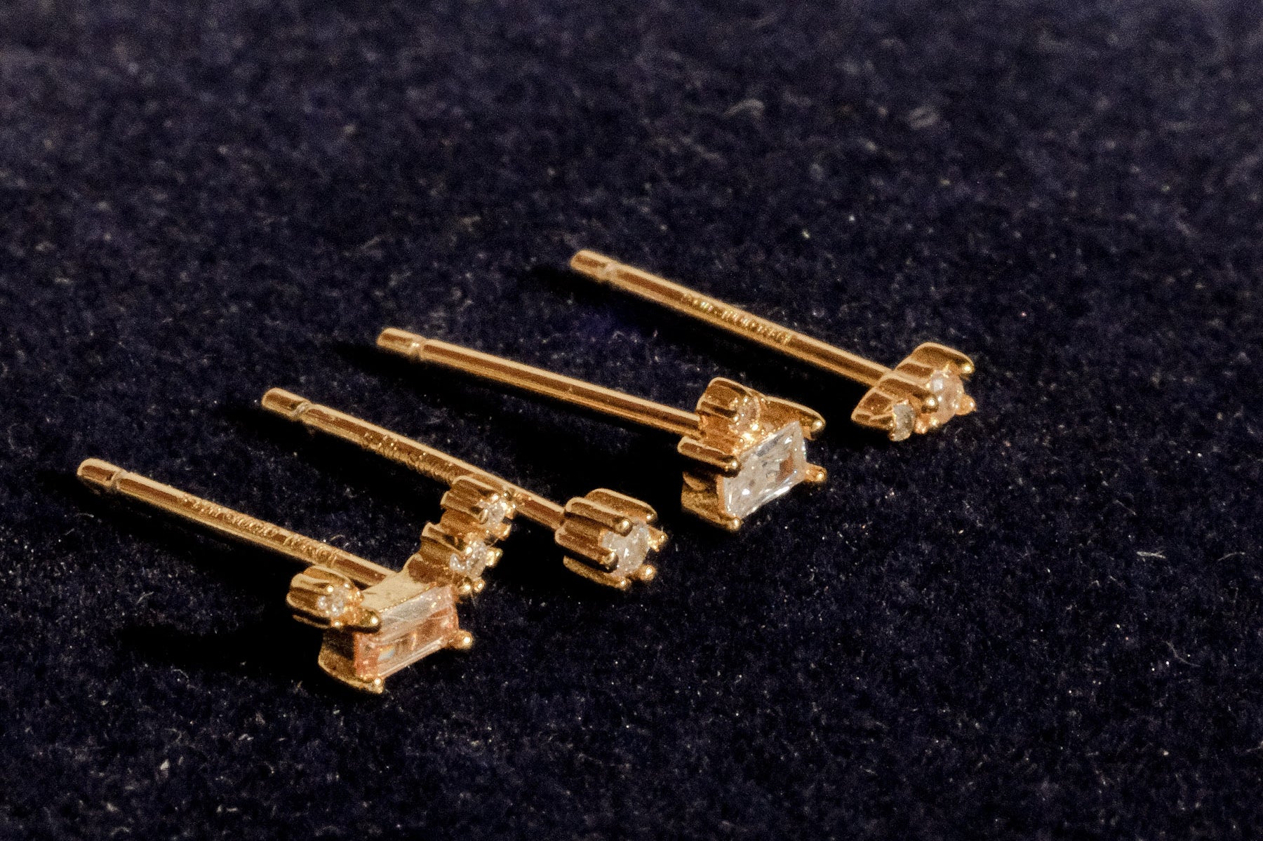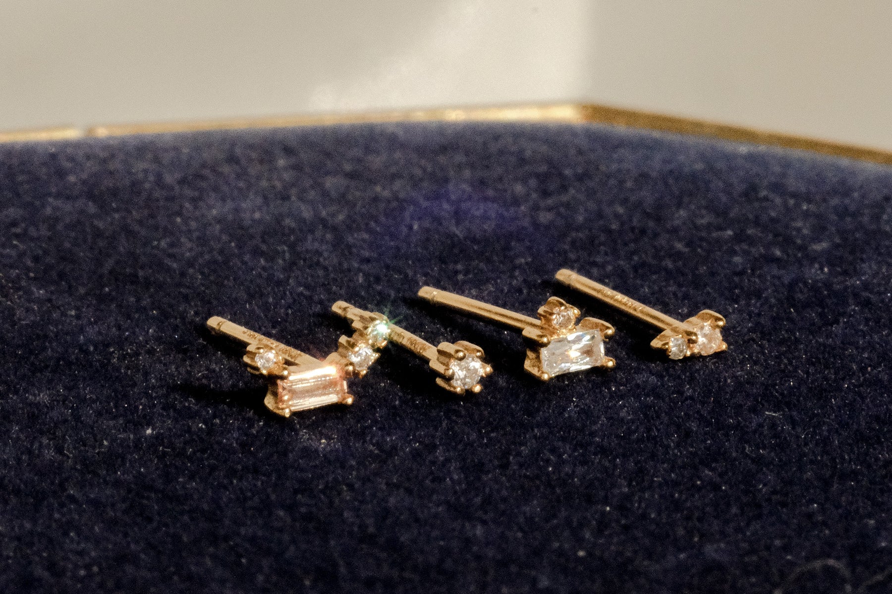 You can finally have your ear candy sorted! Our Gatsby Champagne Crystal Earrings Set offers the perfect combo of playful yet dainty style. With chic champagne cubic zirconia and luxurious accents, these stud earrings are the ideal solution for those looking to get their ear-curation on point! Layer with our ball back or flat back piercings to upgrade your daily stack!