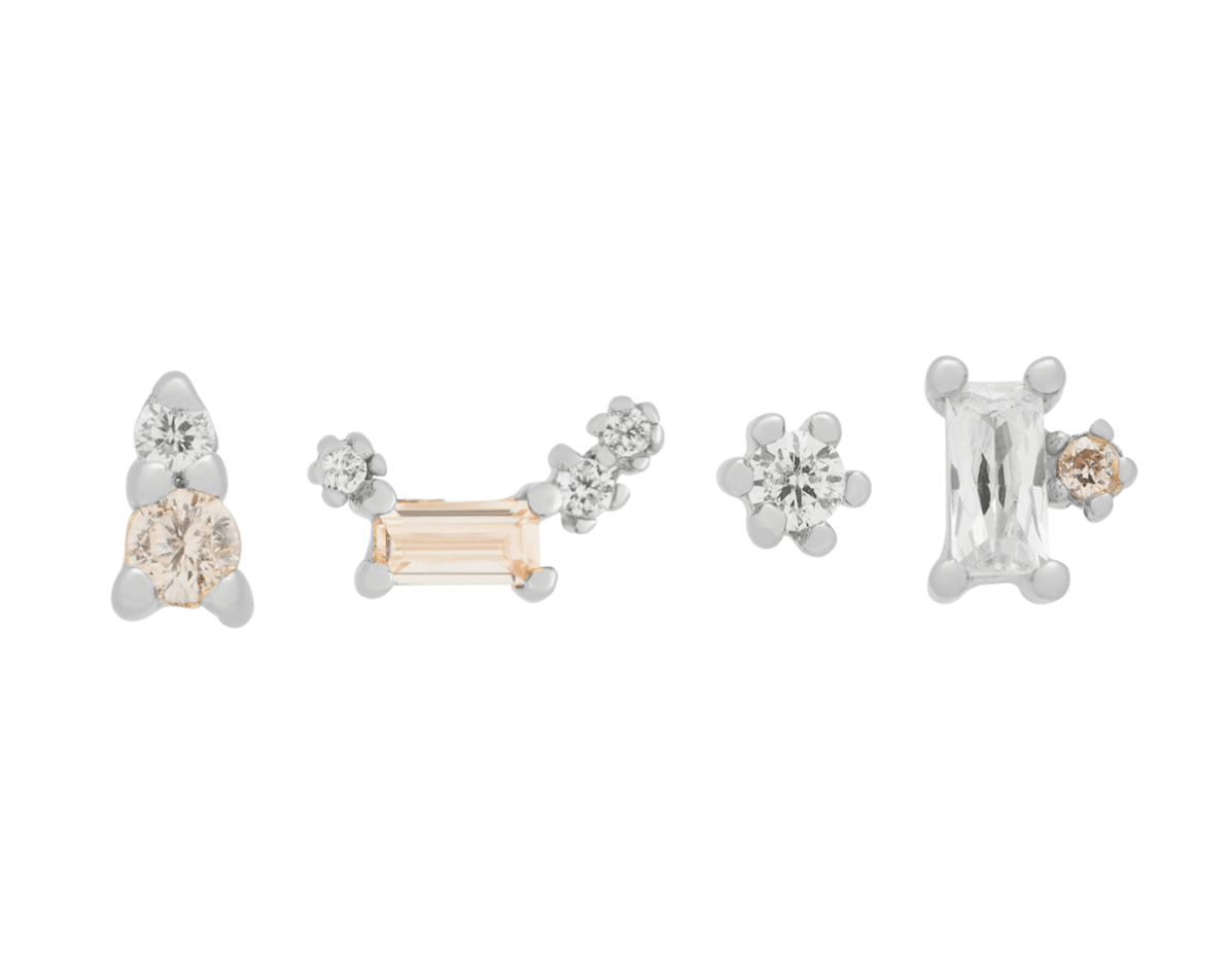 You can finally have your ear candy sorted! Our Gatsby Champagne Crystal Earrings Set offers the perfect combo of playful yet dainty style. With chic champagne cubic zirconia and luxurious accents, these stud earrings are the ideal solution for those looking to get their ear-curation on point! Layer with our ball back or flat back piercings to upgrade your daily stack!