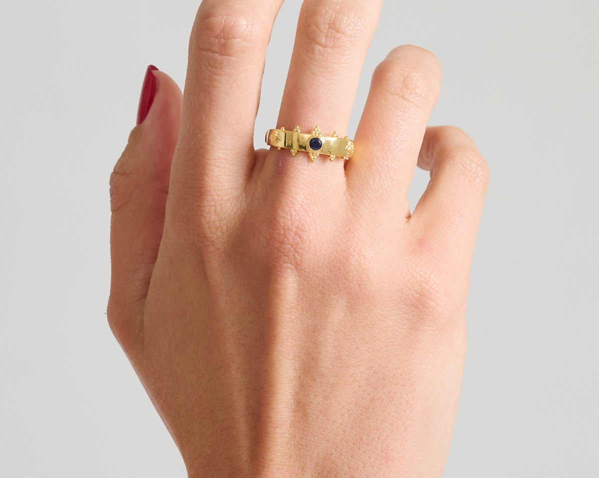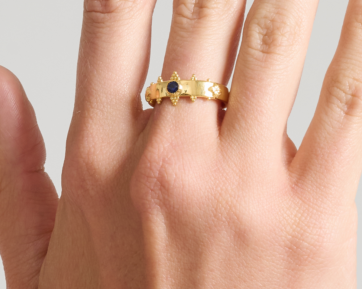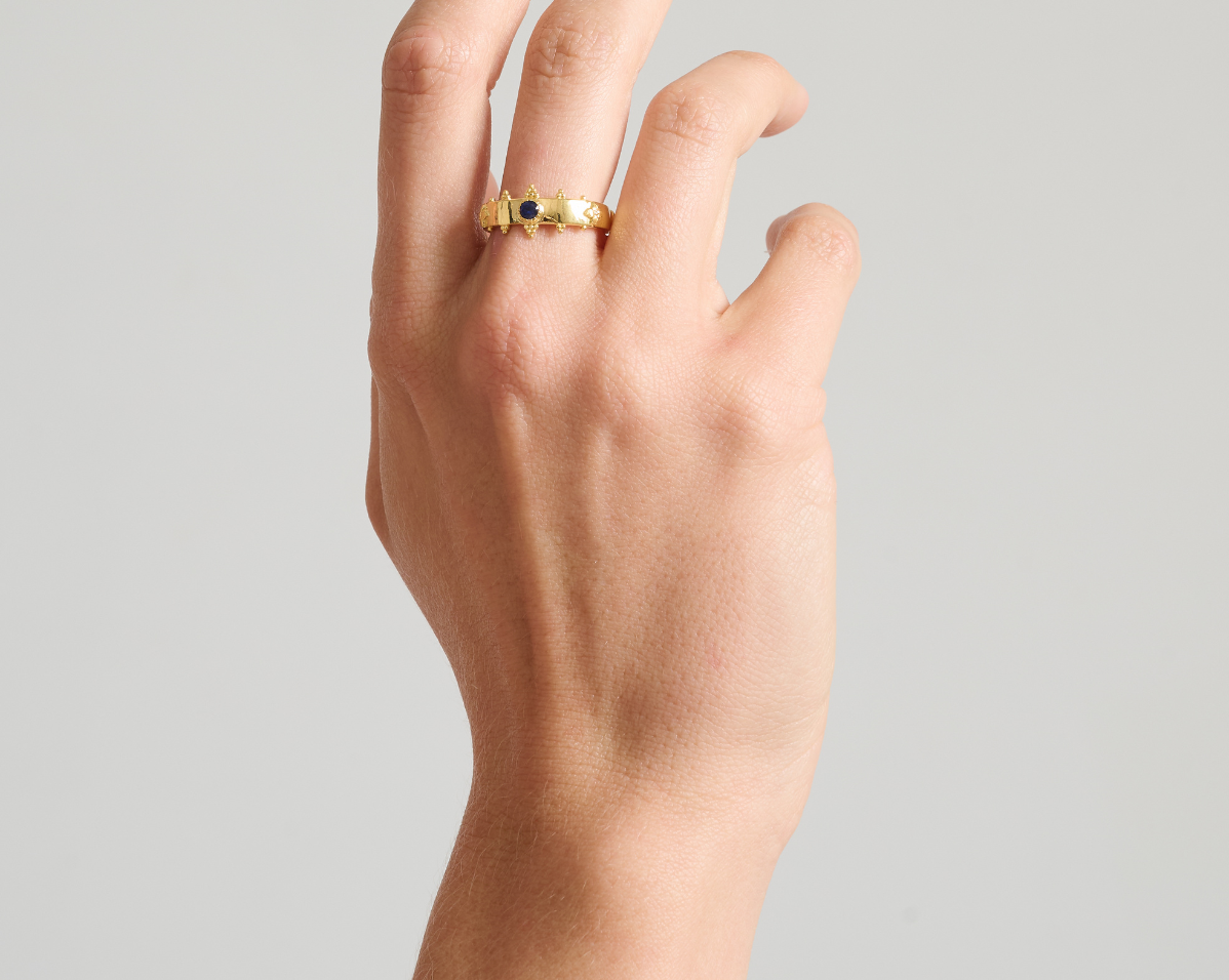 - Features a signature crown silhouette with hand-set sapphires and bead-granule detailing