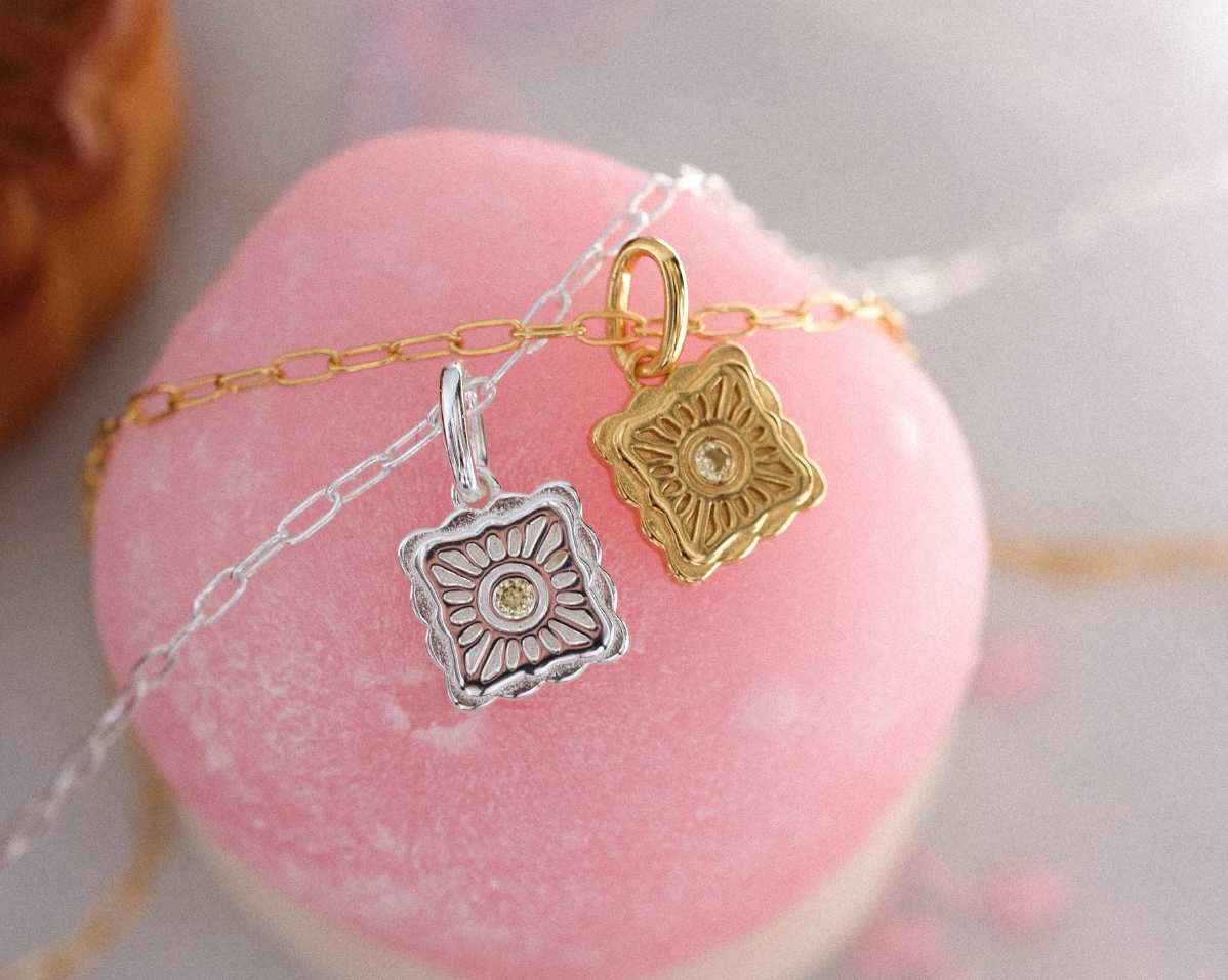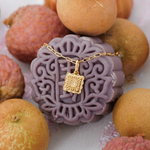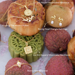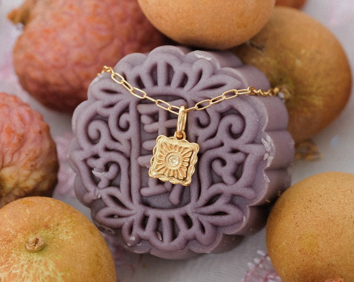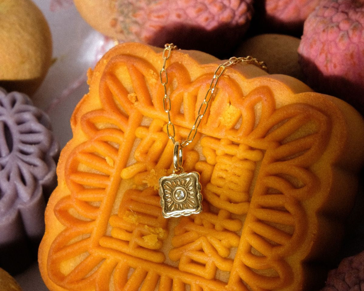 Named after the molten egg yolk center of traditional mooncakes, the Liu Xin Square Mooncake Necklace is a golden ode to Mid-Autumn nostalgia. Its square, scalloped pendant mirrors the delicate pattern of an ornate mooncake, while a citrine cubic zirconia at the center represents the rich, golden heart within.