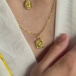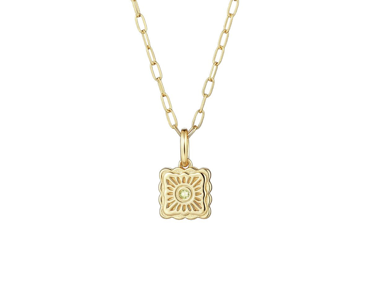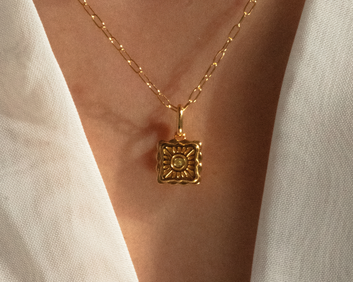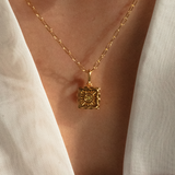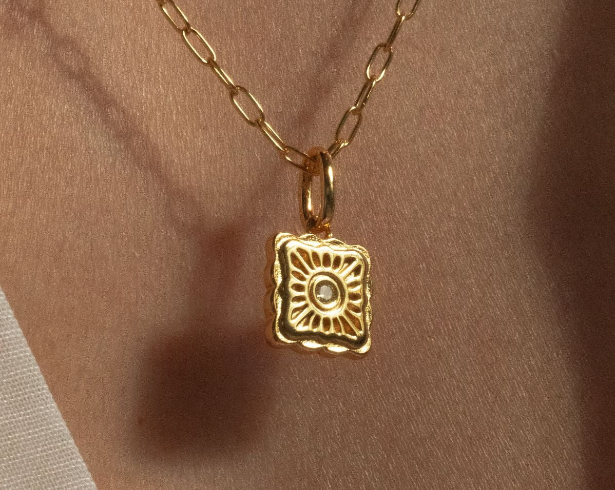 Named after the molten egg yolk center of traditional mooncakes, the Liu Xin Square Mooncake Necklace is a golden ode to Mid-Autumn nostalgia. Its square, scalloped pendant mirrors the delicate pattern of an ornate mooncake, while a citrine cubic zirconia at the center represents the rich, golden heart within.