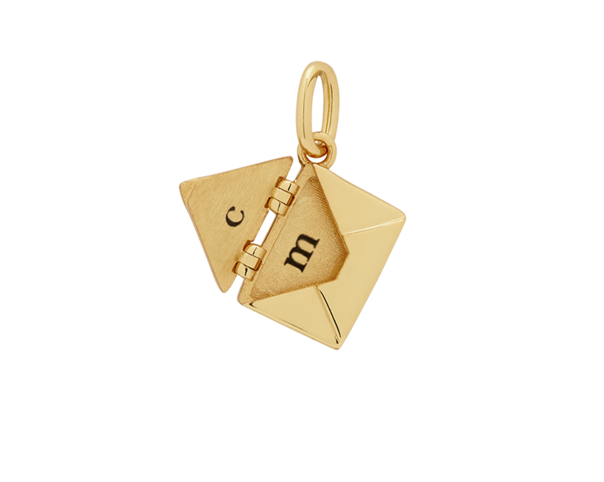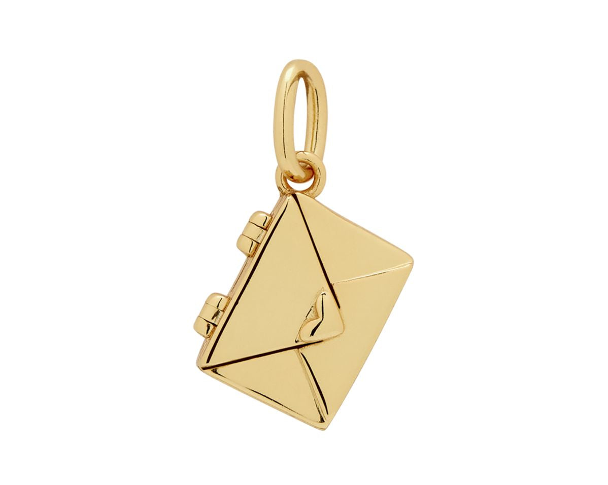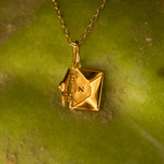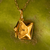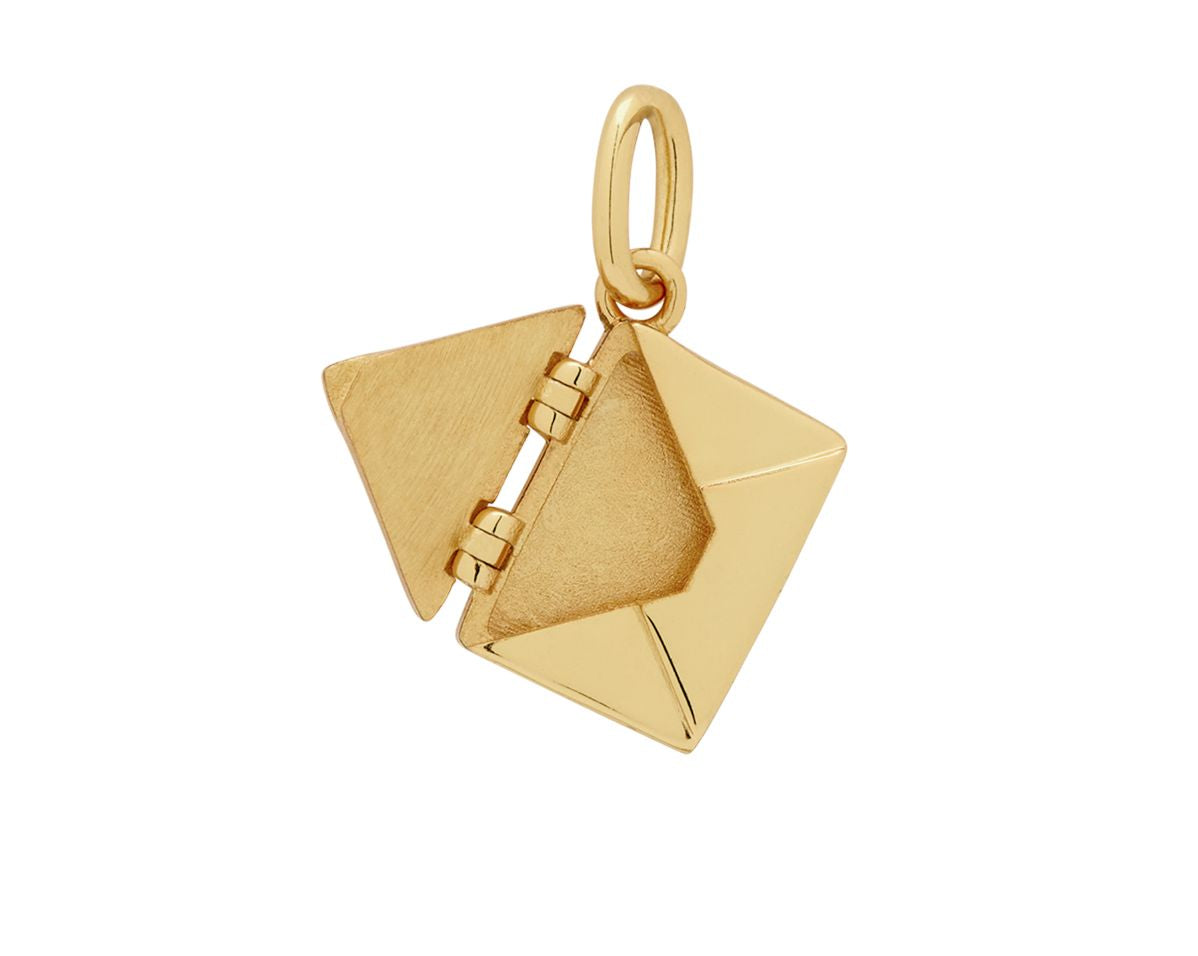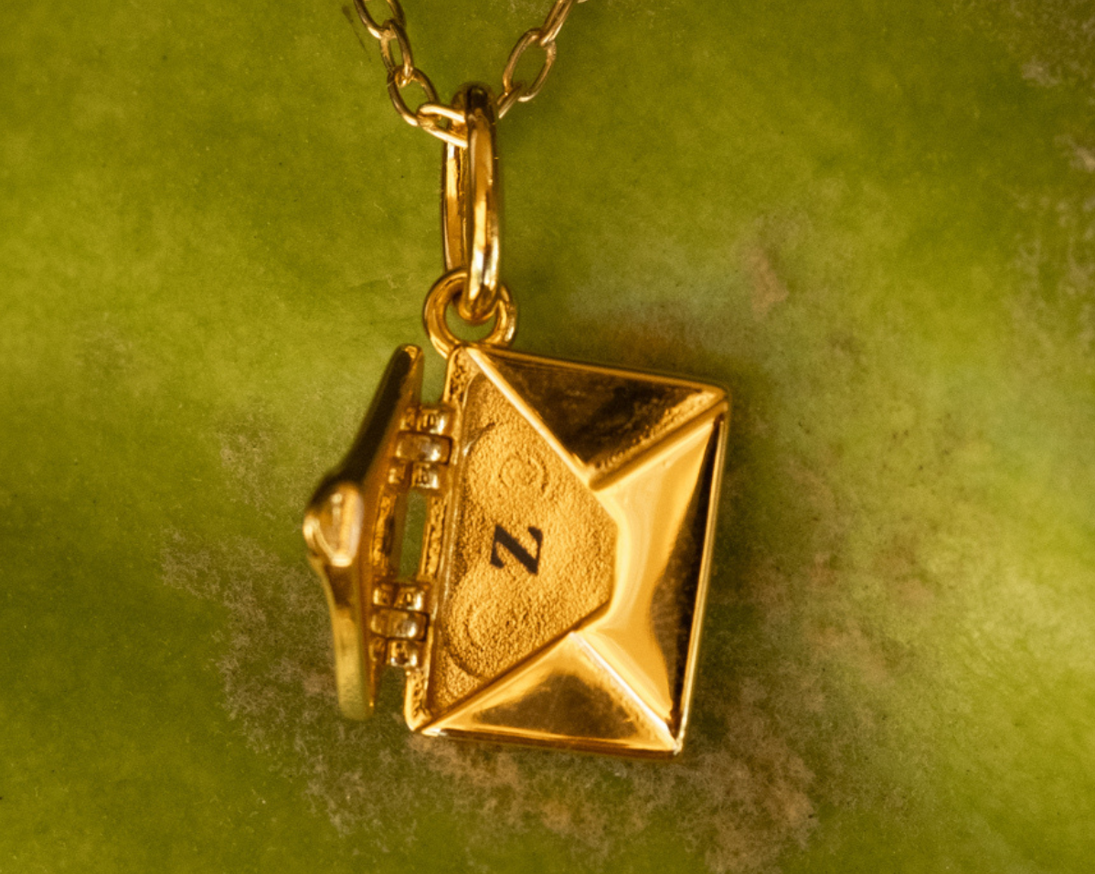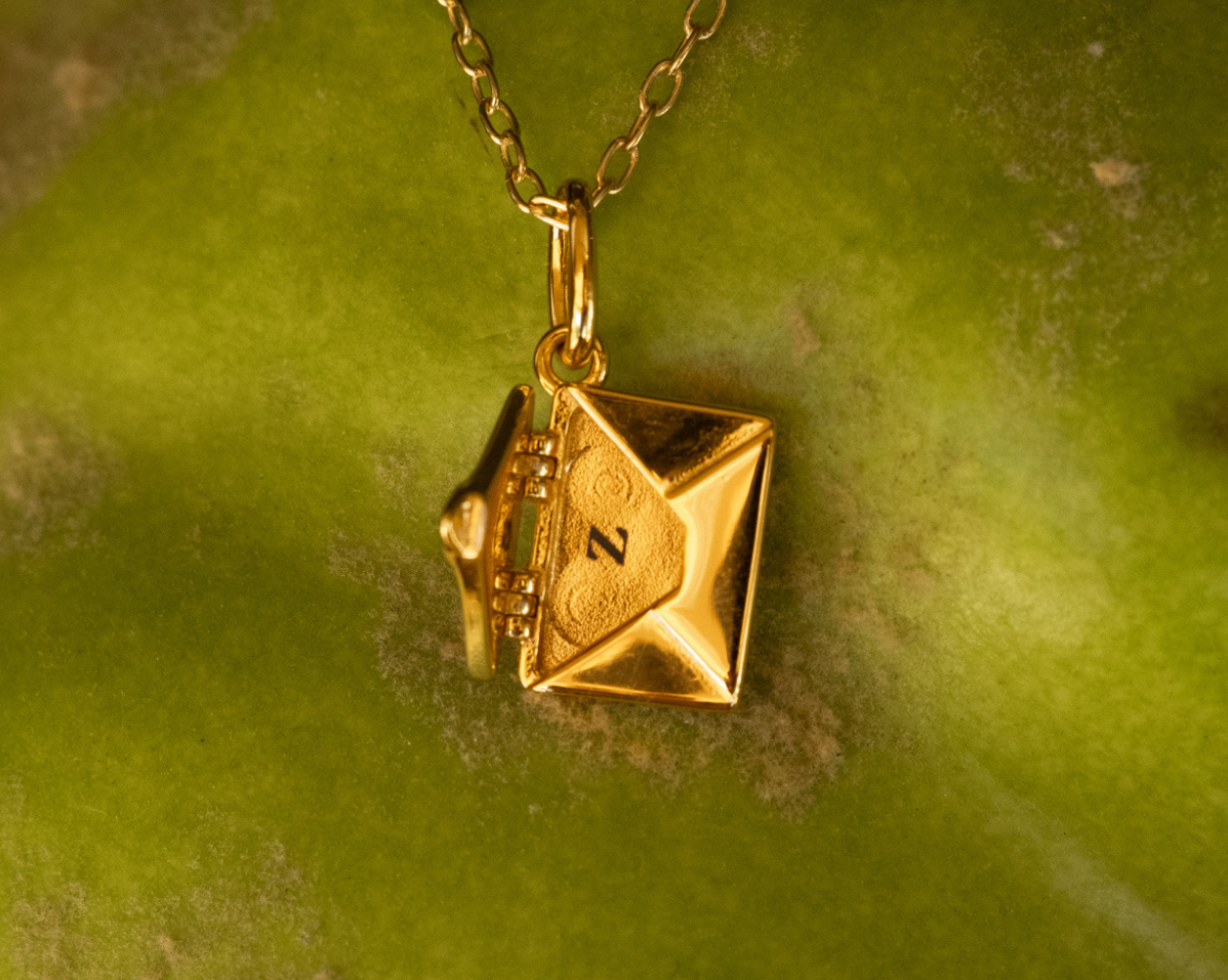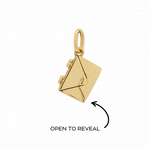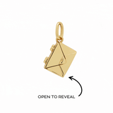 The pendant features an intricate envelope design that opens to reveal a miniature plaque—perfect for engraving a name, date, or secret message (plaque size: 10mm x 7mm, 0.8mm thick). Every angle is considered, from the polished back to the secure hinged clasp and dainty bail for your chain.