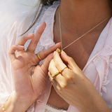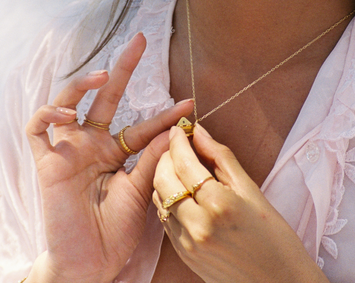 With any type of jewelry, even solid gold and solid silver, regular cleaning and upkeep is needed to keep your jewelry in its best condition. Simply use warm water and soap or a polishing cloth to clean. You can use our jewelry in water, however do wipe it down with warm water after you’re done, especially after being submerged in salt water. Sweat can also make your jewelry duller quicker, especially necklaces, so remove these when you are working out. Avoid exposing your jewelry to skin care products, soaps, detergents and perfumes. Store your jewelry in your S-kin Studio pouch or box to avoid moisture and metal on metal rubbing.