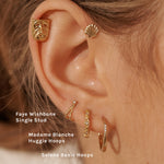 Directly inspired by our Madame Blanche Huggie Hoops, the Madame Blanche Ear Cuff is also adorned with white topaz stones for an intricate and mystical addition to your earring collection. This little cuff can be worn your helix without the actual piercings.