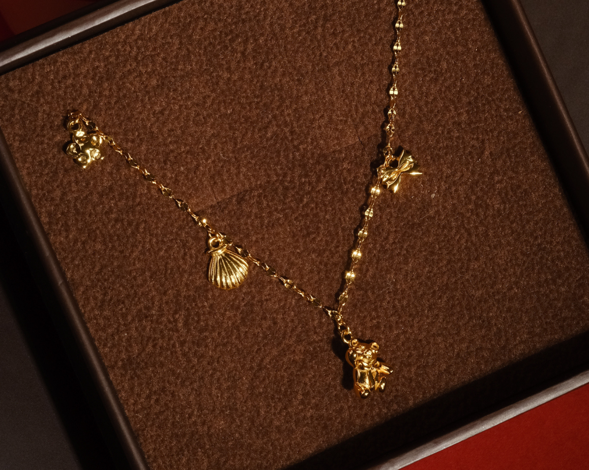 - Features a golden chain adorned with seashells, florals, and sparkles, symbols of sun-soaked memories.