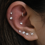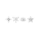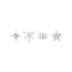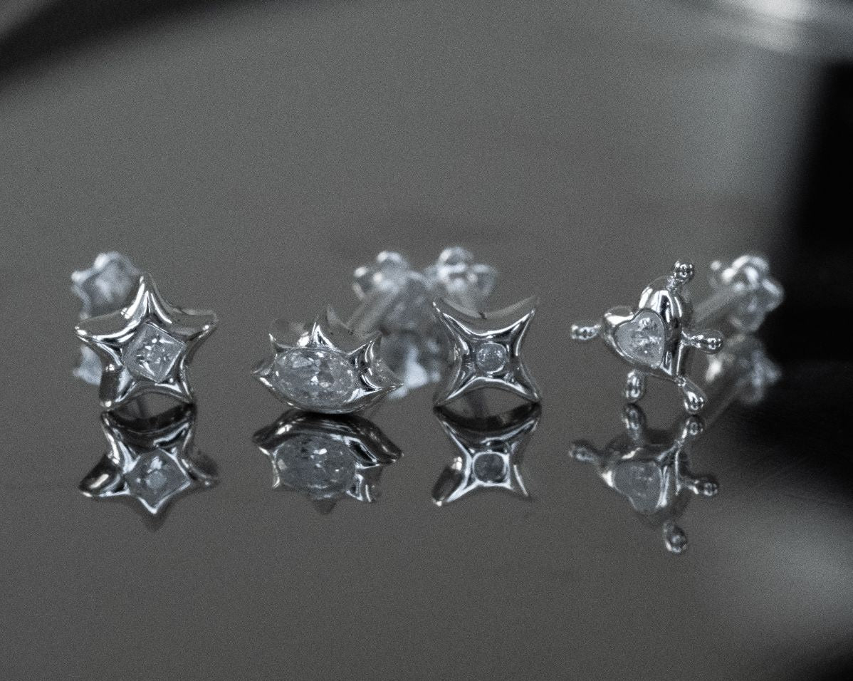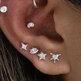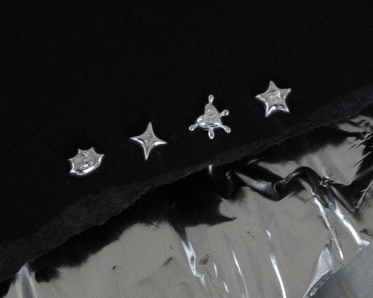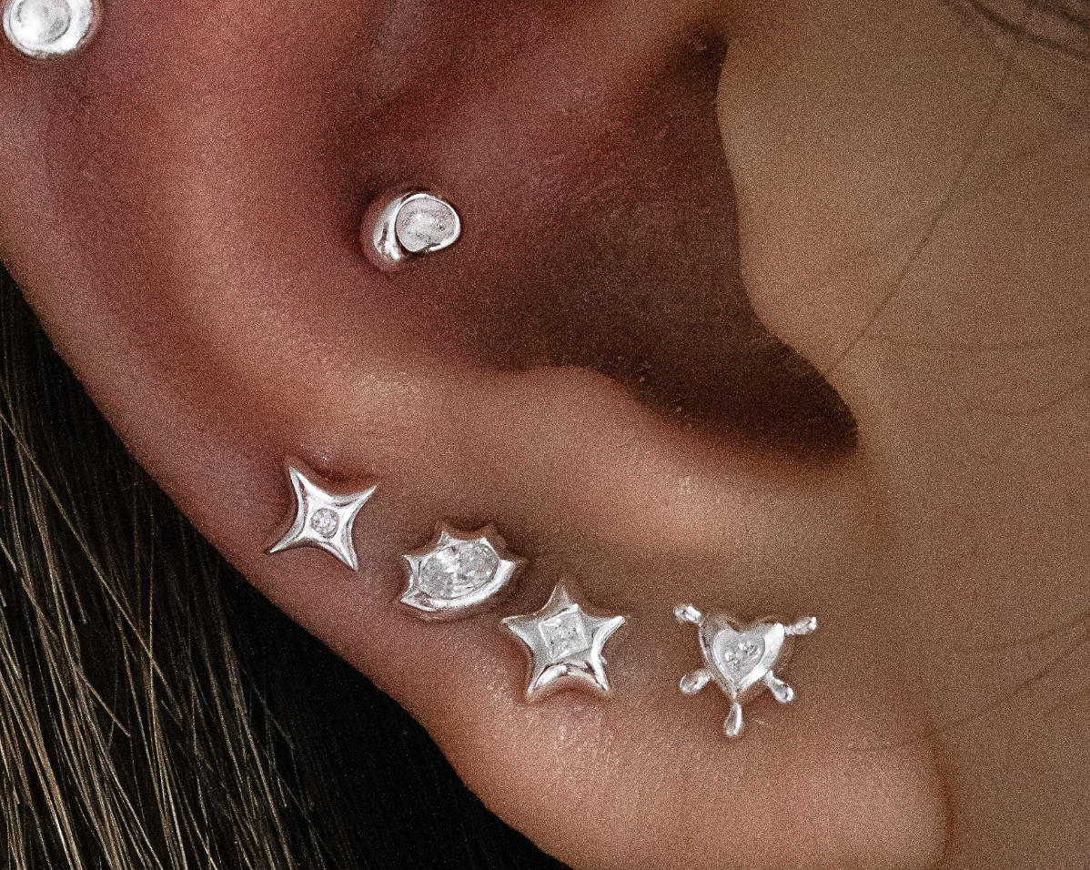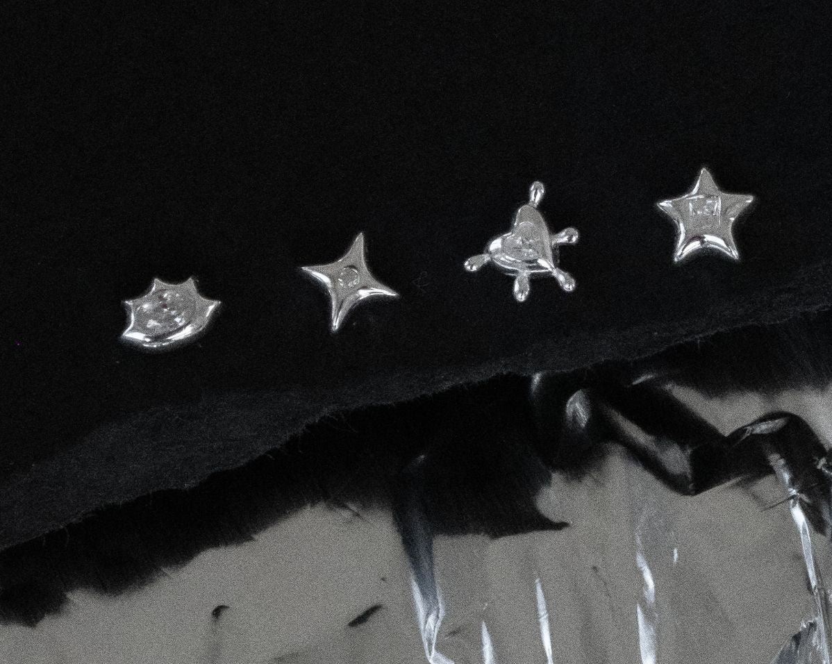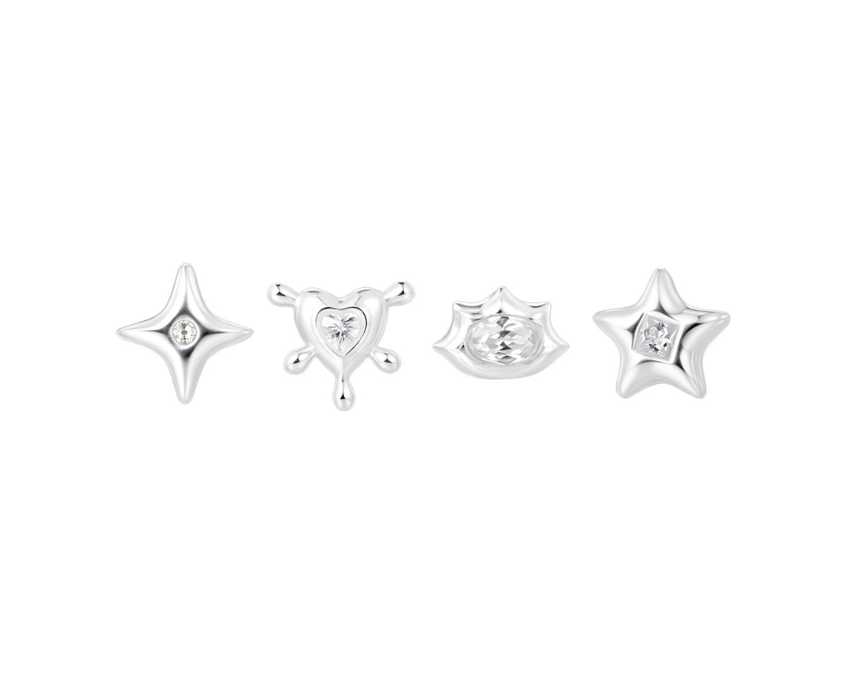 Cute, chaotic, and a little cosmic, Mila is your alter ego’s dream ear stack. This set of four studs mixes starbursts, hearts, and edgy geometrics, each finished with a touch of sparkle that feels equal parts Y2K anime girl and silver baddie.