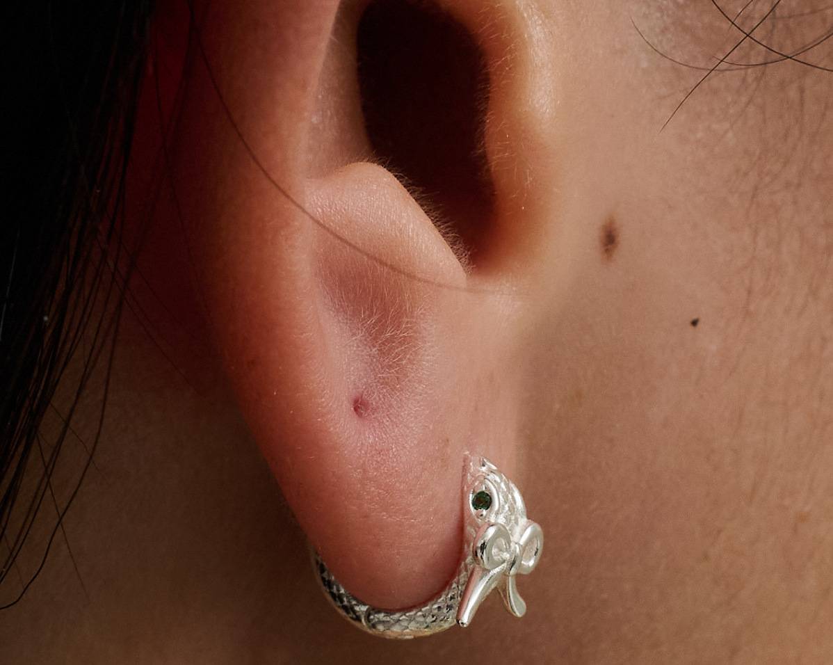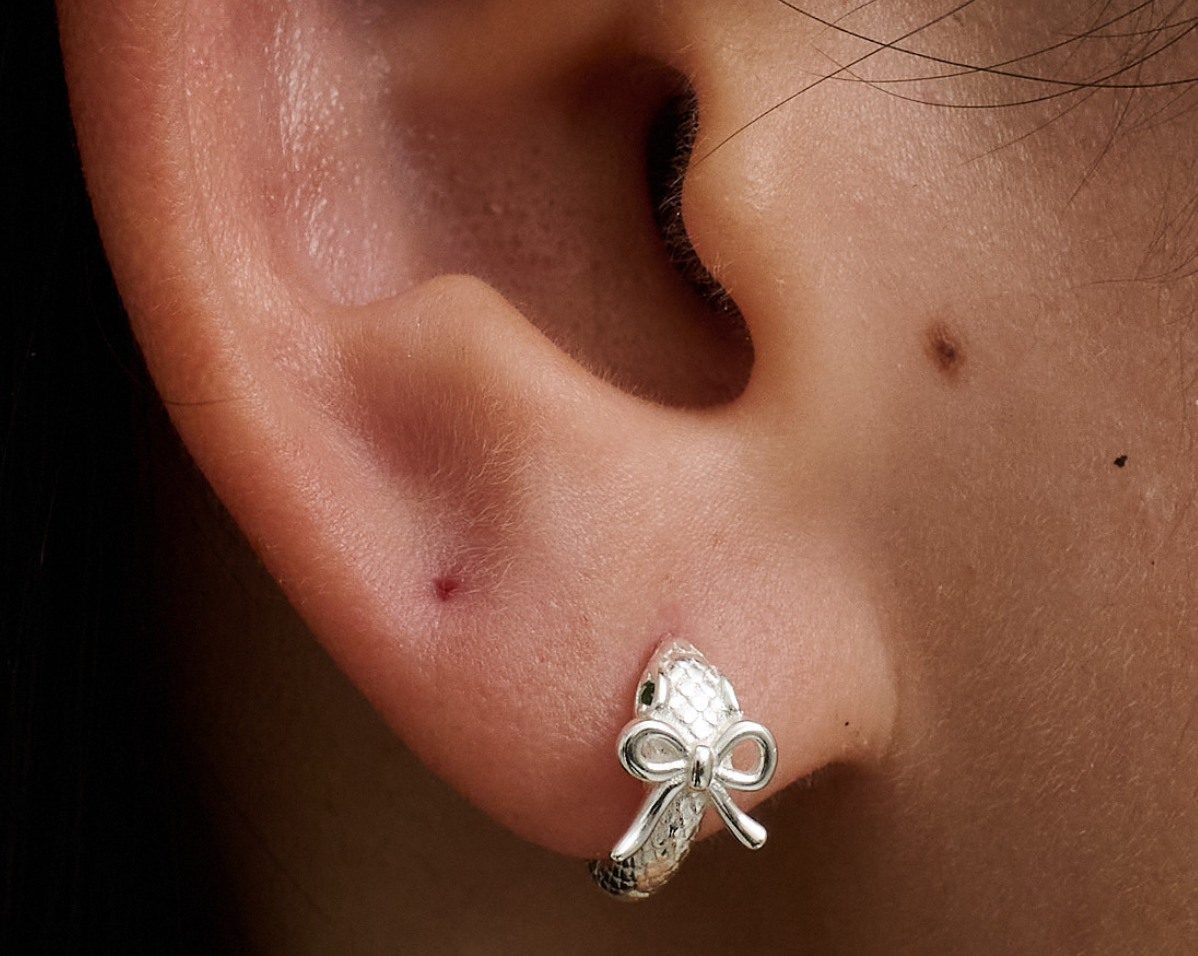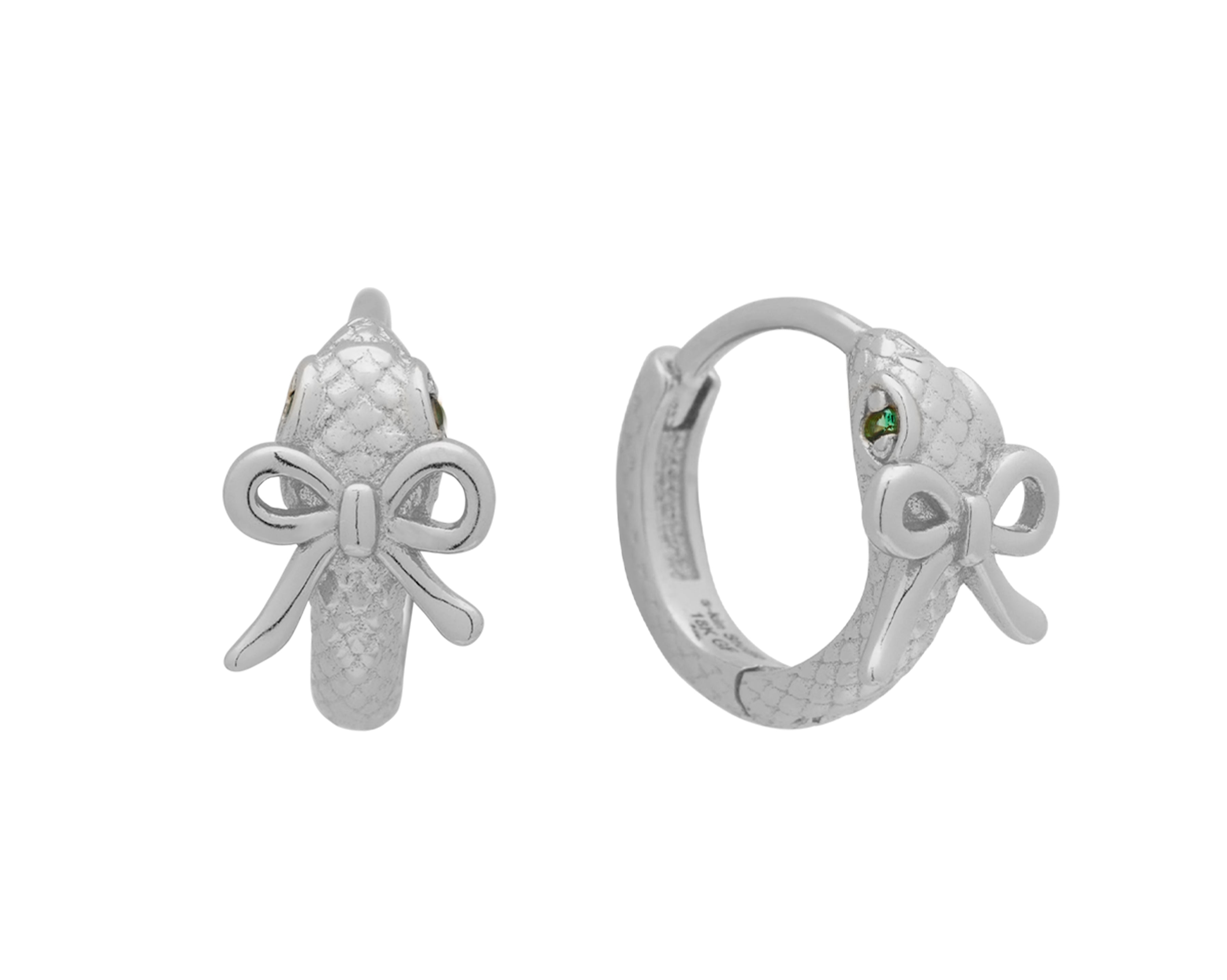 Inspired by Nagini, a character from Harry Potter who transformed from a human to snake due to a blood curse. This unique design features her signature bow and green emerald cz stones, capturing her ever so elegant yet mysterious nature.