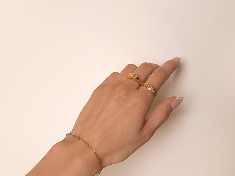 With any type of jewelry, even solid gold and solid silver, regular cleaning and upkeep is needed to keep your jewelry in its best condition. Simply use warm water and soap or a polishing cloth to clean. You can use our jewelry in water, however do wipe it down with warm water after you’re done, especially after being submerged in salt water. Sweat can also make your jewelry duller quicker, especially necklaces, so remove these when you are working out. Avoid exposing your jewelry to skin care products, soaps, detergents and perfumes. Store your jewelry in your S-kin Studio pouch or box to avoid moisture and metal on metal rubbing.