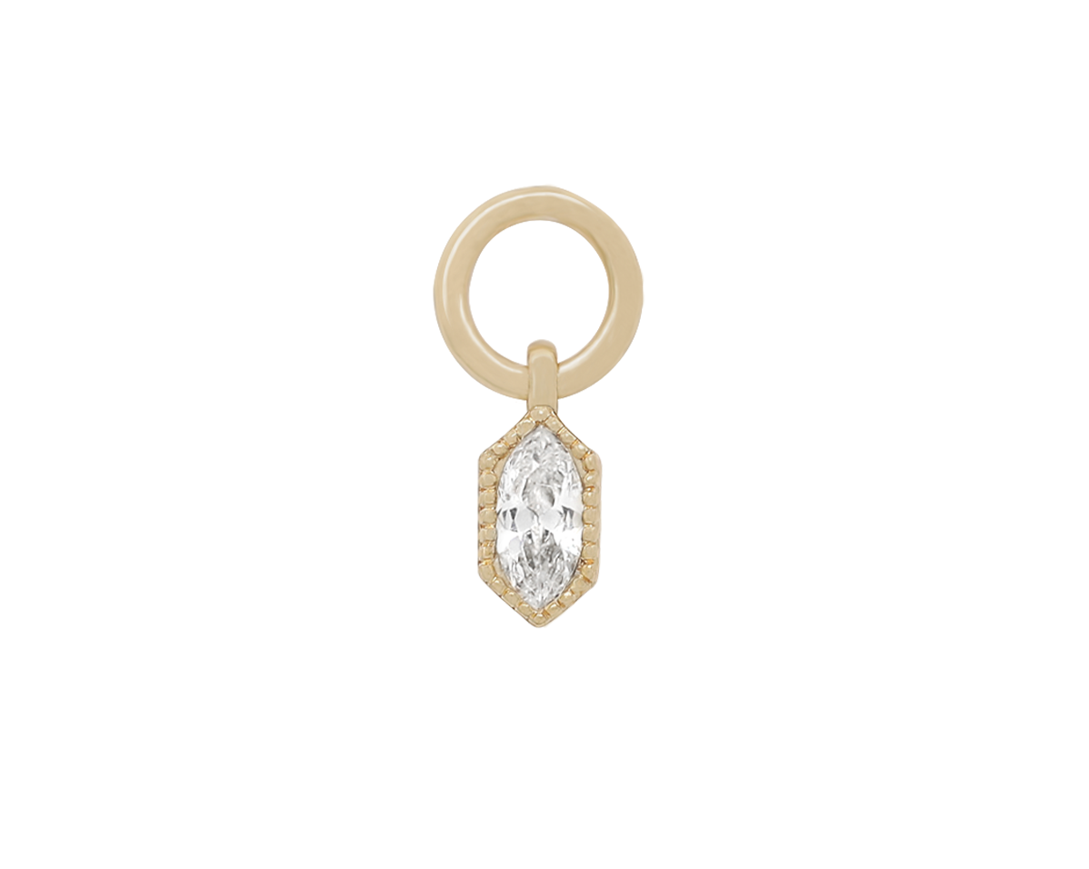 The descendent of the Rei Marquise Dangle Single Stud, this charm pays homage to its ancestor with a matching marquise cut stone in white. Add this petite charm to any of your hoop earrings for a customised unique look.