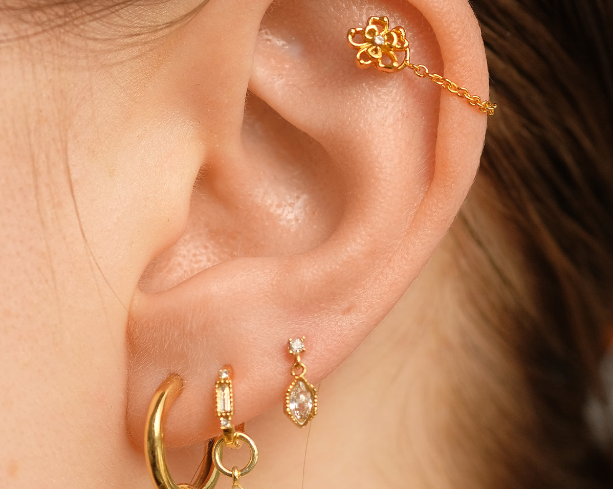 Inspired by the desire to have beautiful and high quality earrings for all our ear piercings, the Piercing Collection is suitable for fresh and healed piercings. With lobe friendly hoops and helix friendly ball back studs, the Piercing Collection can cater for fresh and healing piercings with our 14k solid gold earrings whilst our classic 18k gold fill earrings can be worn in all healed ear piercings. Made ethically in our factories in Mumbai, India, each Piercing Collection piece has been carefully crafted by our artisans just for you.