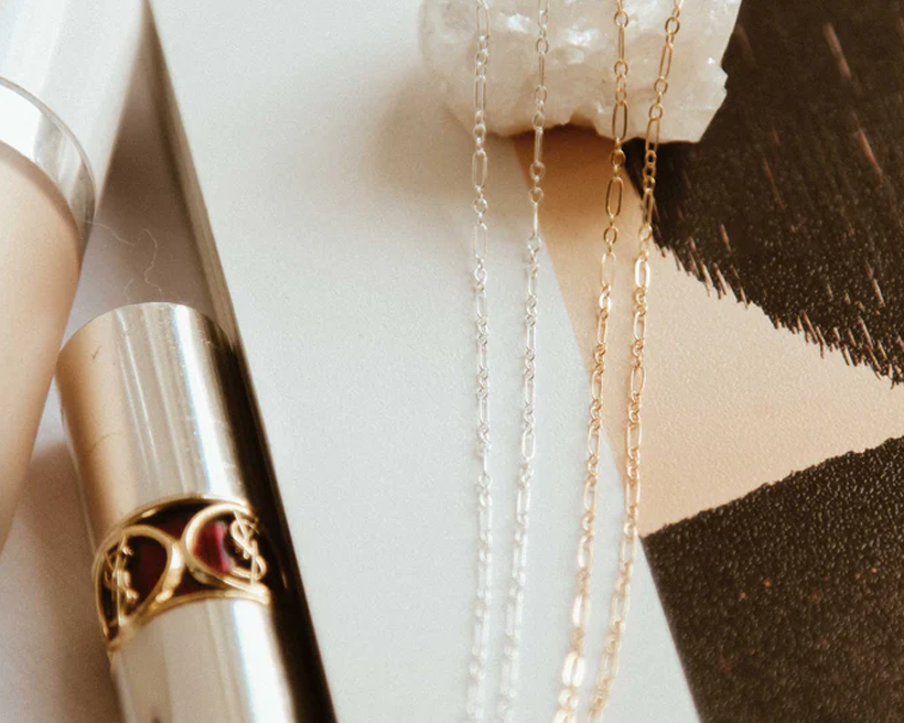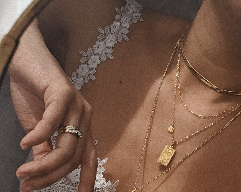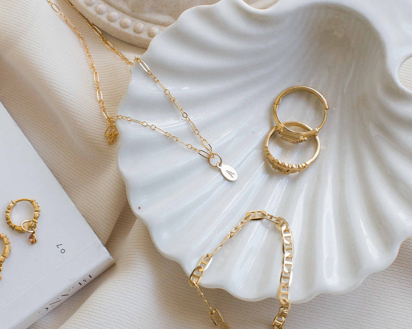 With any type of jewelry, even solid gold and solid silver, regular cleaning and upkeep is needed to keep your jewelry in its best condition. Simply use warm water and soap or a polishing cloth to clean. You can use our jewelry in water, however do wipe it down with warm water after you’re done, especially after being submerged in salt water. Sweat can also make your jewelry duller quicker, especially necklaces, so remove these when you are working out. Avoid exposing your jewelry to skin care products, soaps, detergents and perfumes. Store your jewelry in your S-kin Studio pouch or box to avoid moisture and metal on metal rubbing.