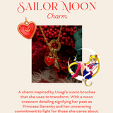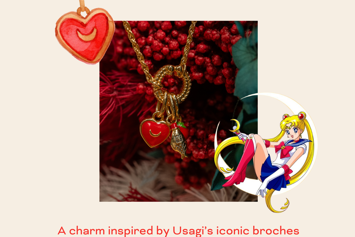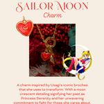 A charm inspired by Usagi’s iconic broches that she uses to transform. With a moon crescent detailing that signifies her upbringing as Princess Serenity and her unwavering commitment to fight for those she cares about.