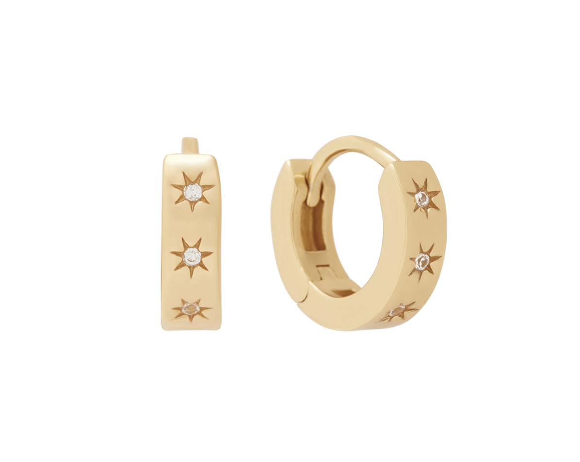 Aurelia is our latest edition to our amazing line up of huggie hoops. Aurelia features a click fasten hoop mechanism, with four gemstones set on the front side of each hoop. She can be paired with many of our charms for an extra added effect.