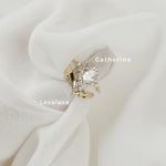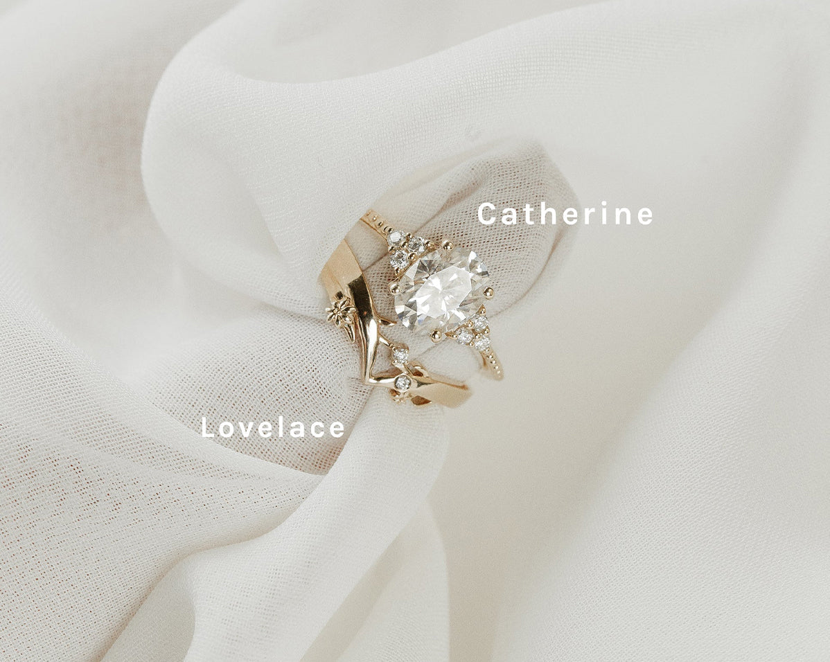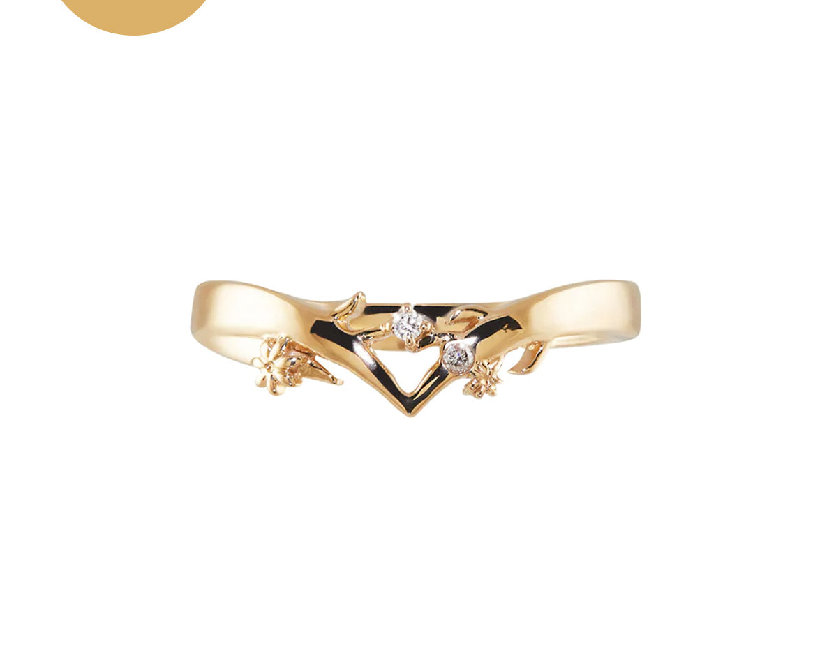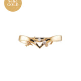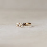 An ode to nature, this unique branch-like ring hugs your finger delicately and forms the stunning Lovelace Wishbone Ring. Adorned with three tiny moissanite stones, this ring is uniquely arched so it can sit underneath your engagement or ceremonial ring.