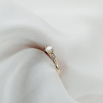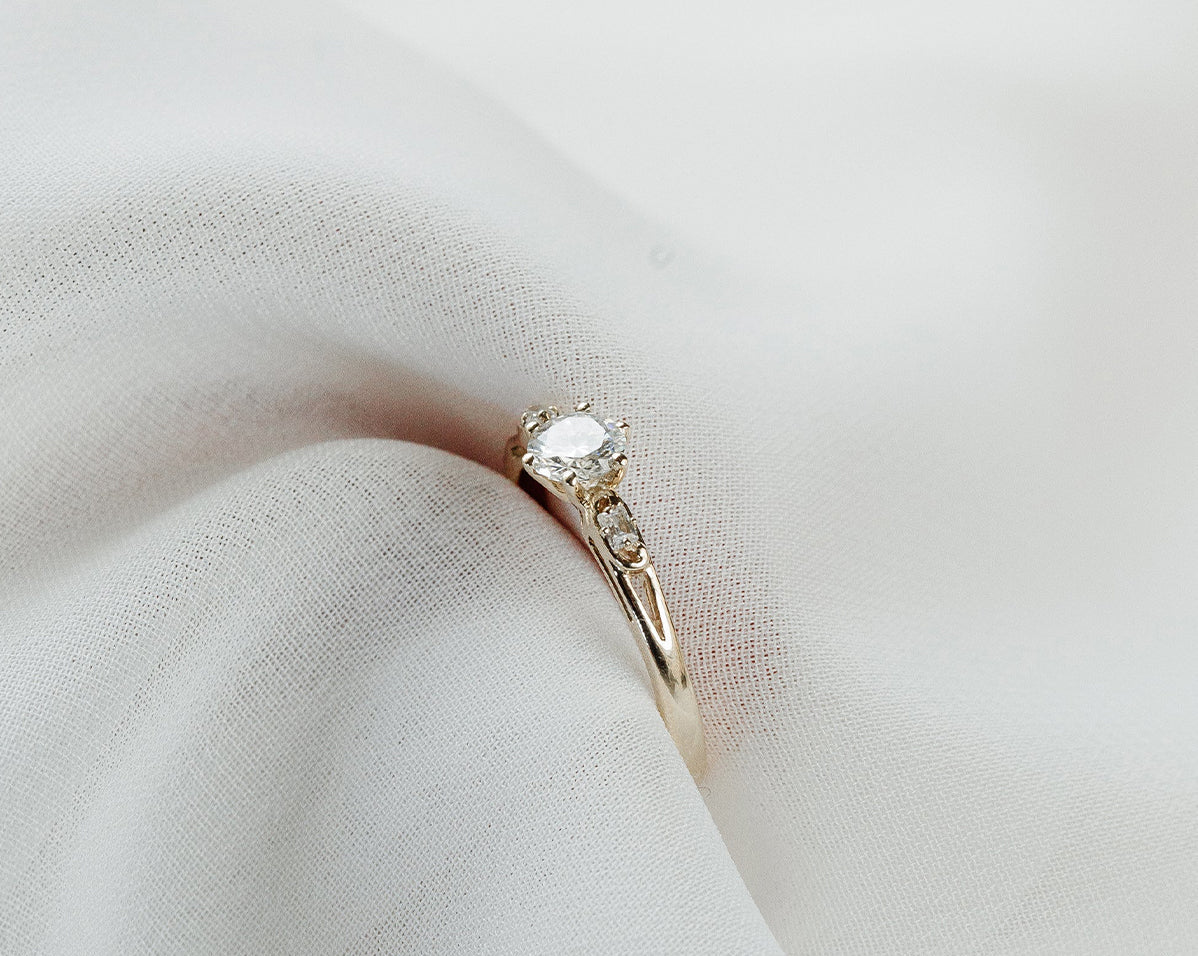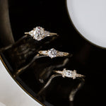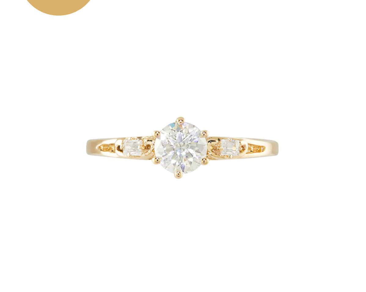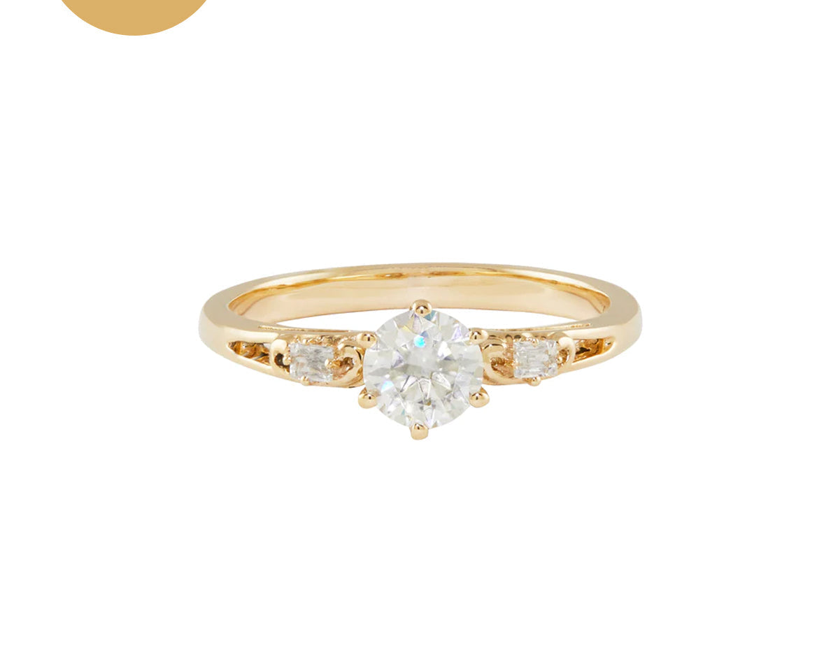 The classic Nightingale Solitaire Ring has a timeless round stone with two uniquely embedded gemstones adorned to either side for a vintage inspired finish.