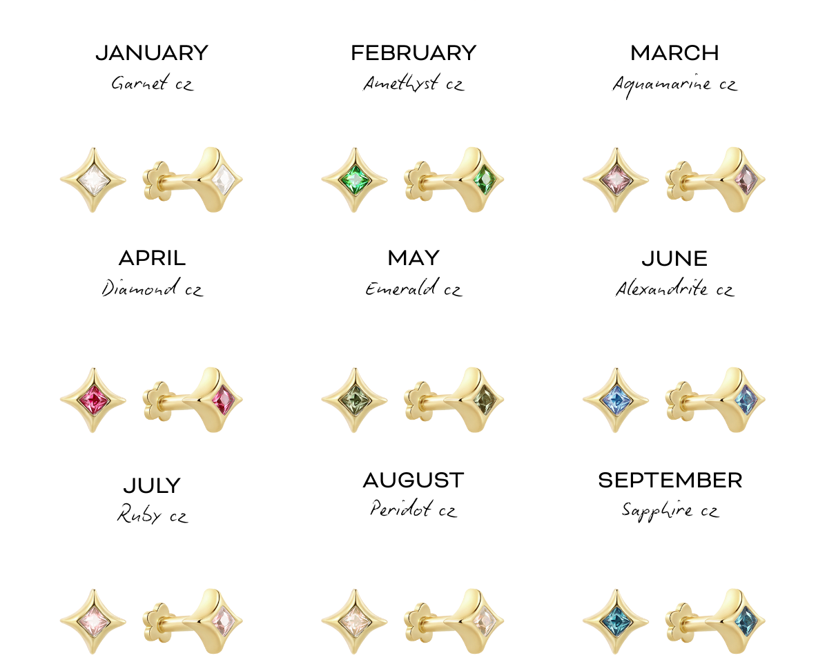 A celebration of light, color, and meaning. The Sparkle Piercing is a star-shaped stud designed to reflect your individuality through twelve dazzling birthstones one for every month of the year. Each piece captures a quiet brilliance, blending elegance with sentiment for a look that feels both personal and timeless.