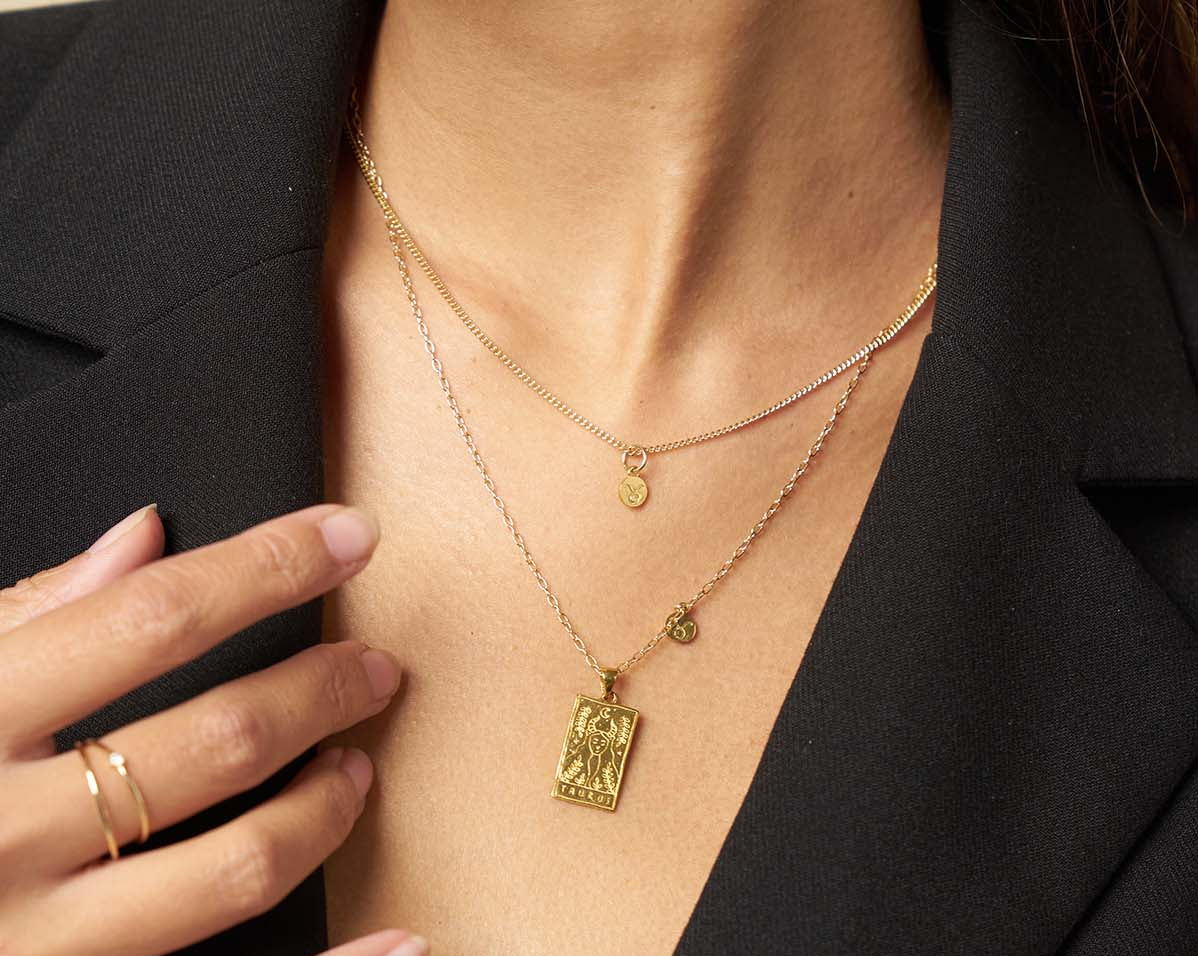 The collection features 12 pendant necklaces with a double-sided tarot-inspired star sign pendant, and a customizable mini star sign charm. Inspired by tarot cards, and the magical world of astrology, the 12 necklaces are customizable with two signs – sun and moon signs – or those with signs on the cusp.
