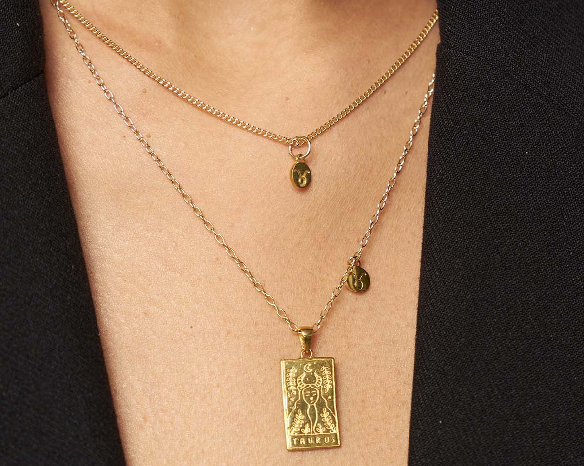 The collection features 12 pendant necklaces with a double-sided tarot-inspired star sign pendant, and a customizable mini star sign charm. Inspired by tarot cards, and the magical world of astrology, the 12 necklaces are customizable with two signs – sun and moon signs – or those with signs on the cusp.