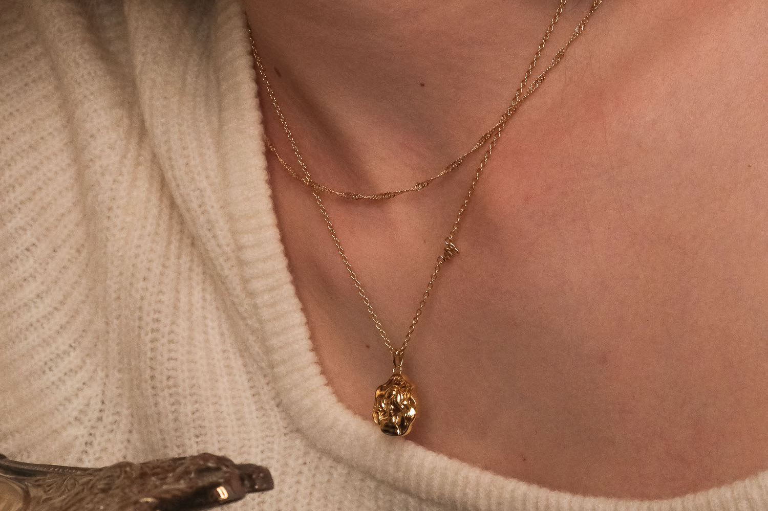 Gold-filled is the closest alternative to solid gold. Gold filled jewelry has a thick layer of solid gold bonded onto the base layer, usually brass or sterling silver. Compared to gold plated which uses a process of electroplating that quickly dips your jewelry in gold, resulting in a miniscule layer of gold, gold-filled is much more durable and long lasting.