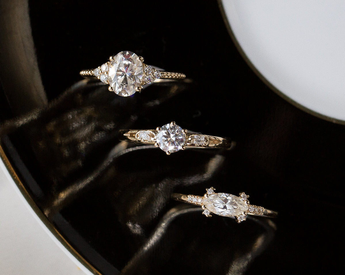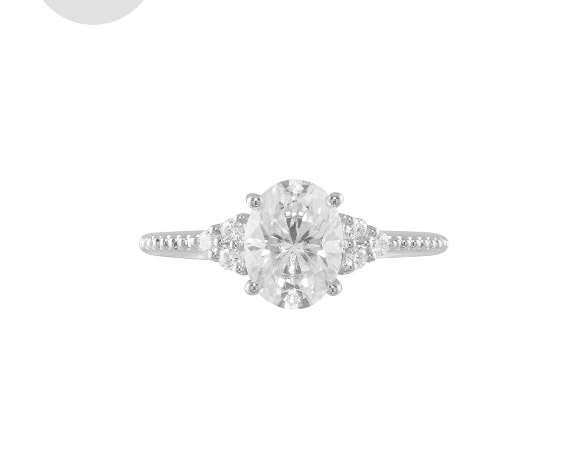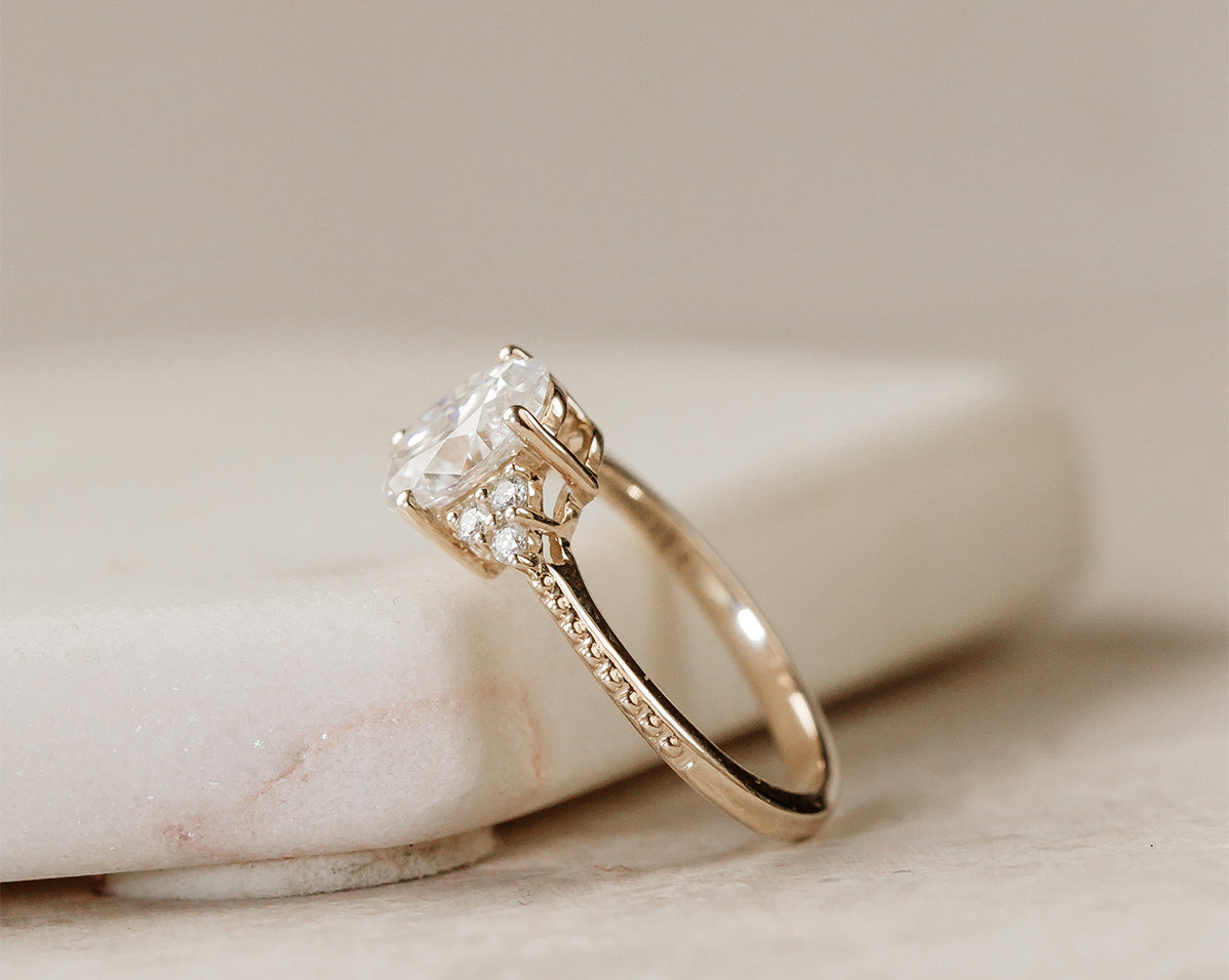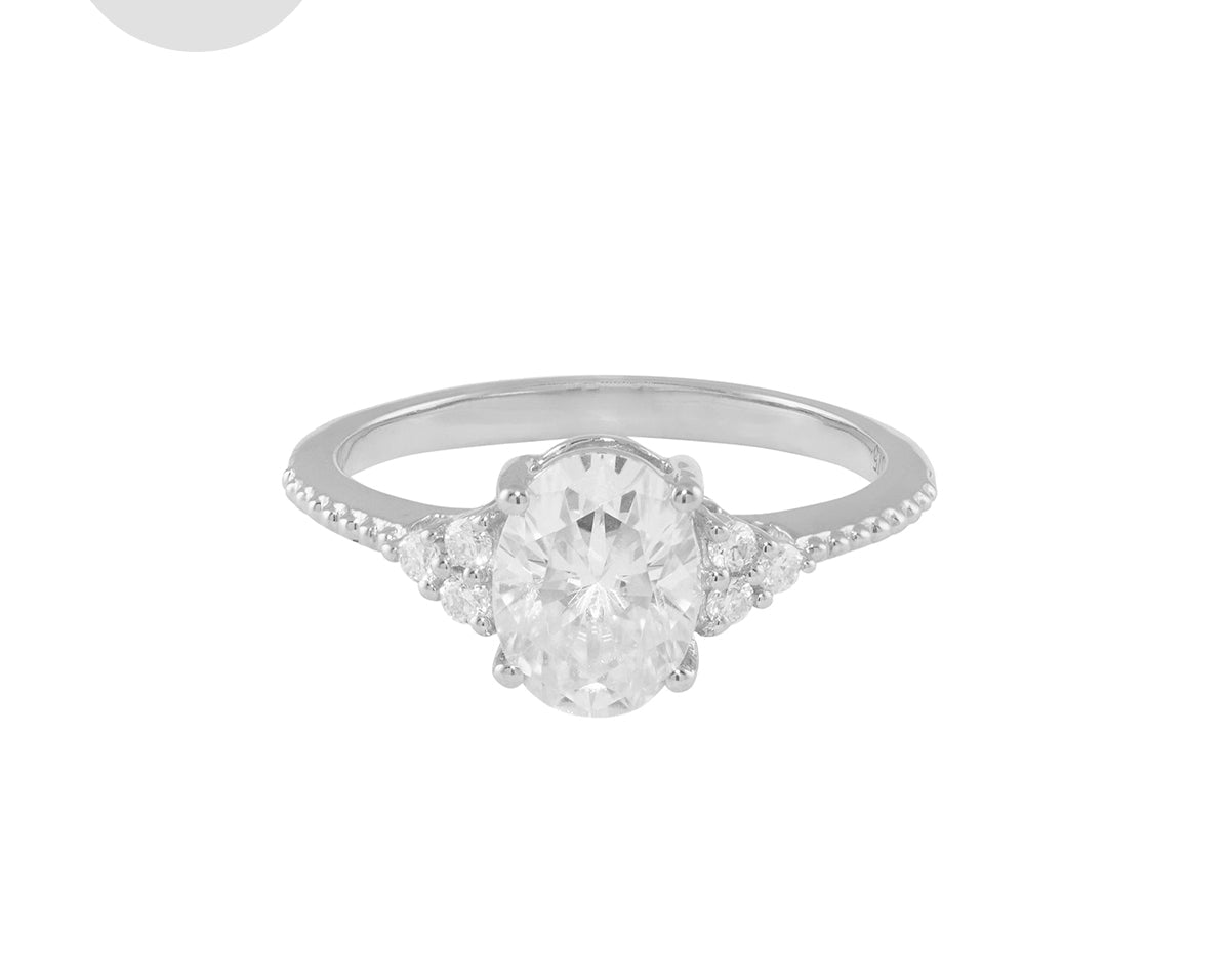 The stunning Catherine Oval Ring features a timeless statement oval-shaped moissanite that is set among several smaller stones. With a Milgrain finish around the band, this ring was made to sparkle.
