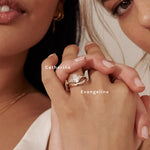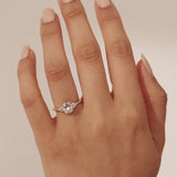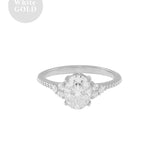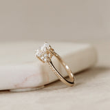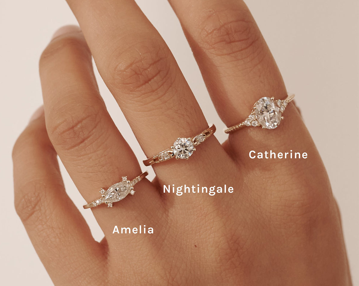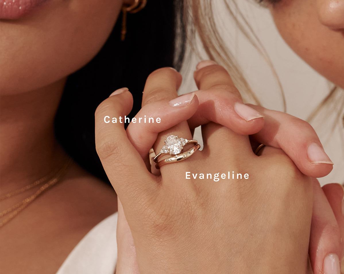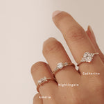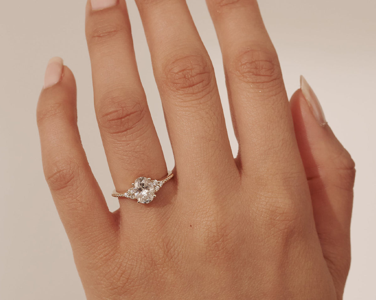 The stunning Catherine Oval Ring features a timeless statement oval-shaped moissanite that is set among several smaller stones. With a Milgrain finish around the band, this ring was made to sparkle.