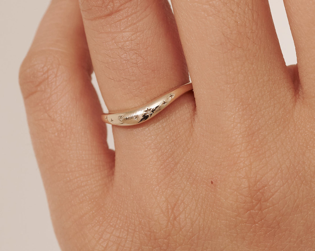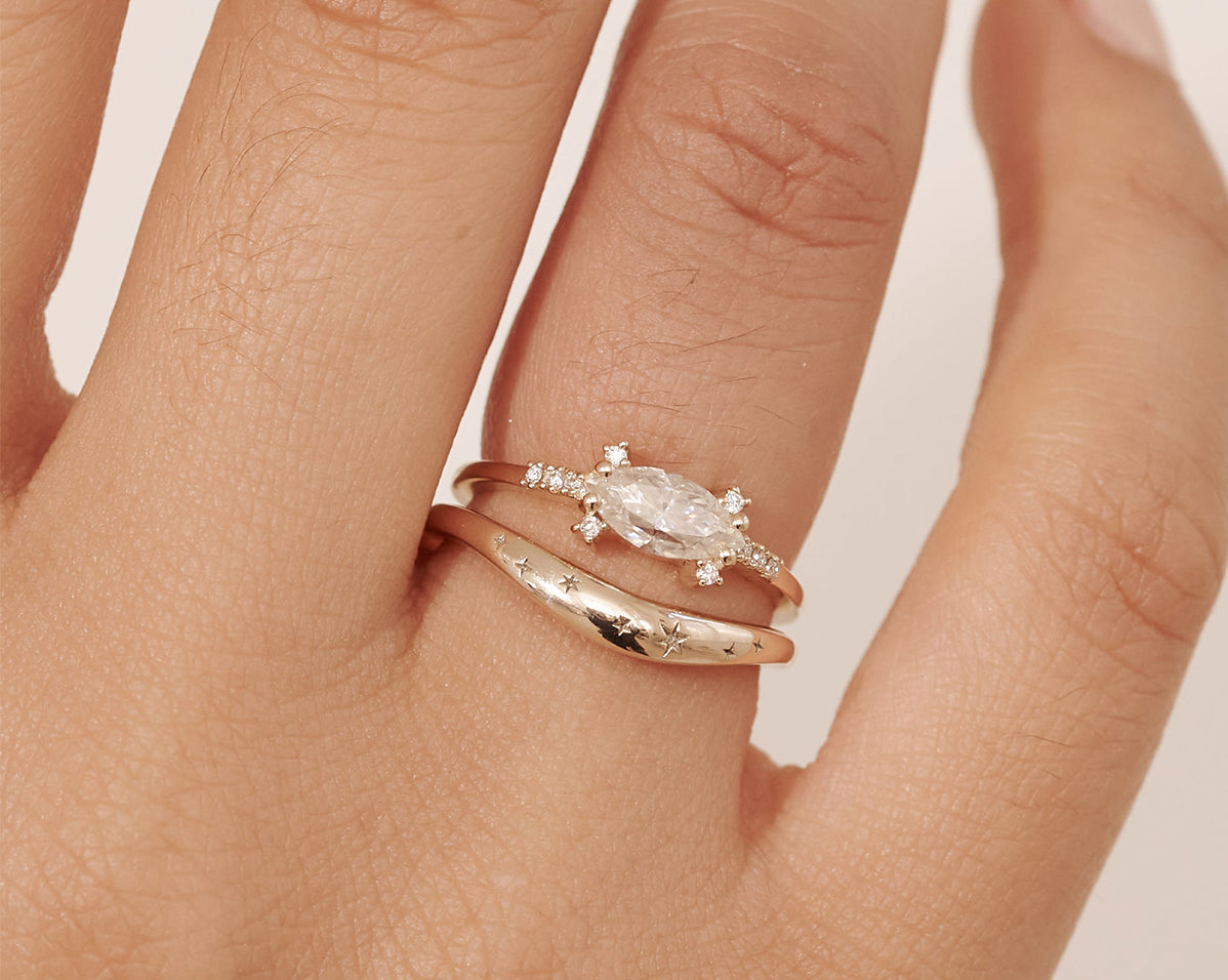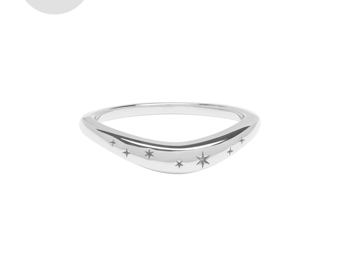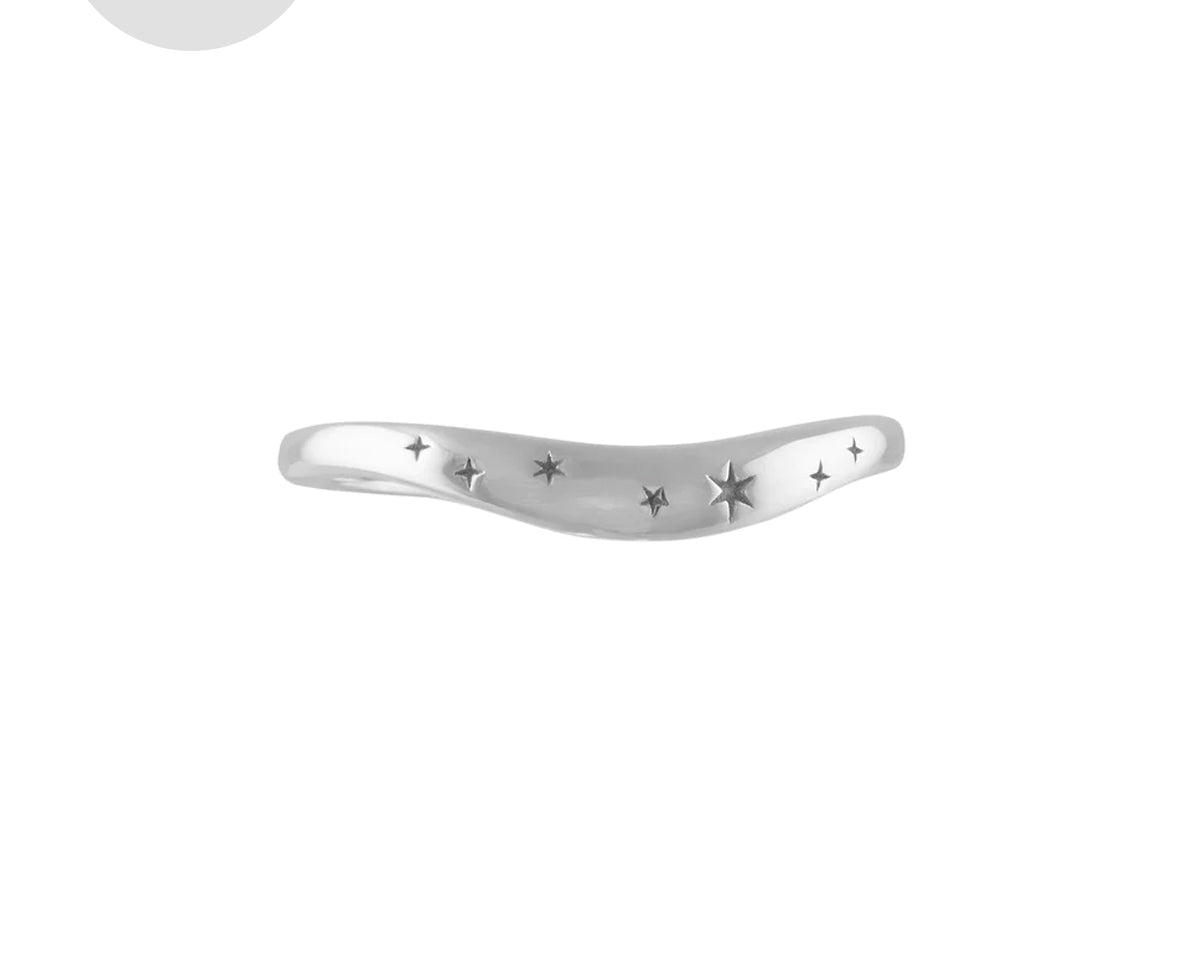 Inspired by the American astrologer, Evangeline Adams, this stunning constellation ring is a constant reminder that the stars are the limit. Evangeline was a late 19th to early 20th century astrologer known for writing and defending a number of popular books about astrology. This uniquely curved ring, like the stars to the planets, has been made to allow you to fit your engagement or ceremonial ring neatly on top.