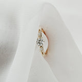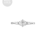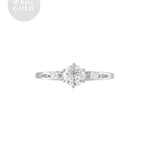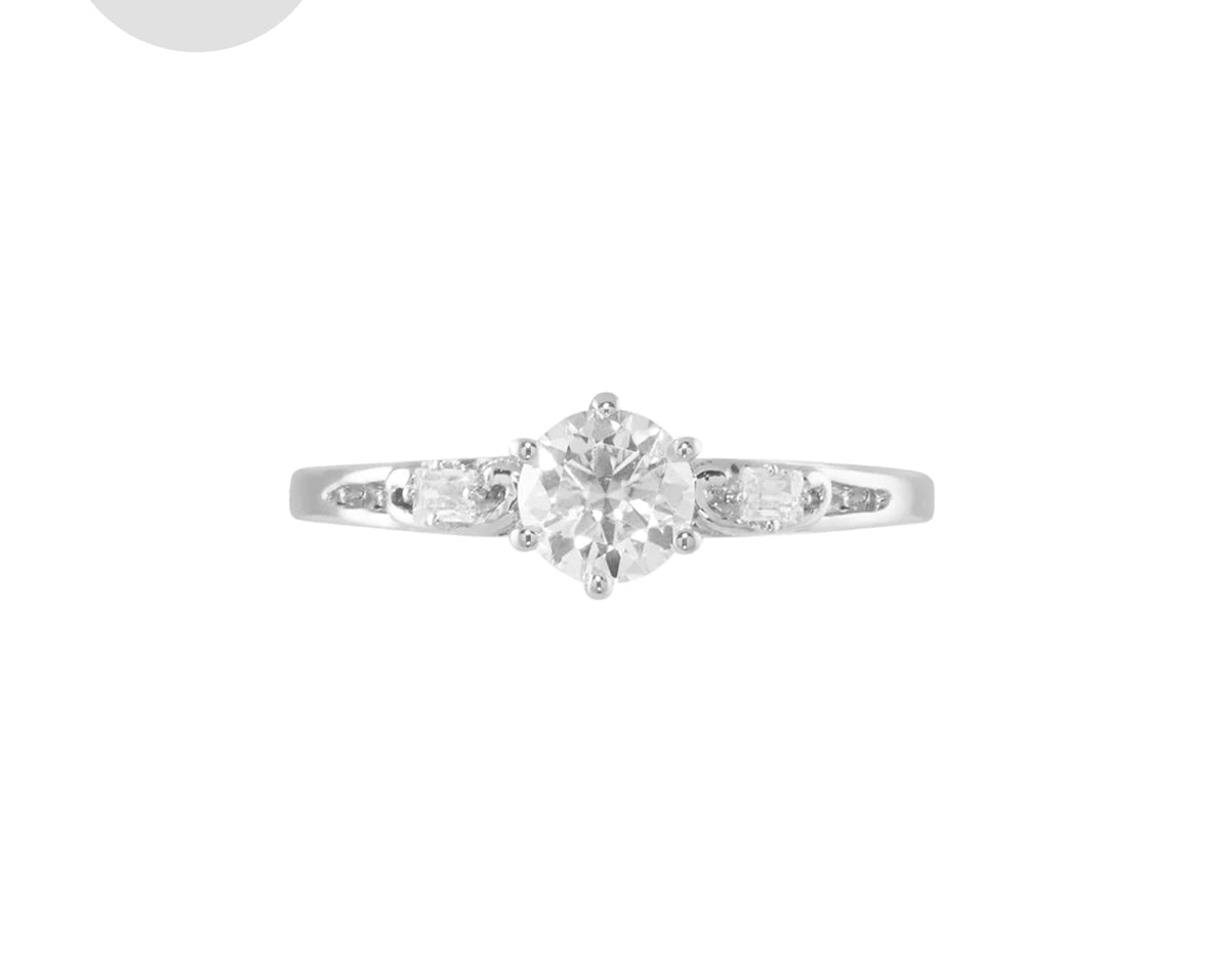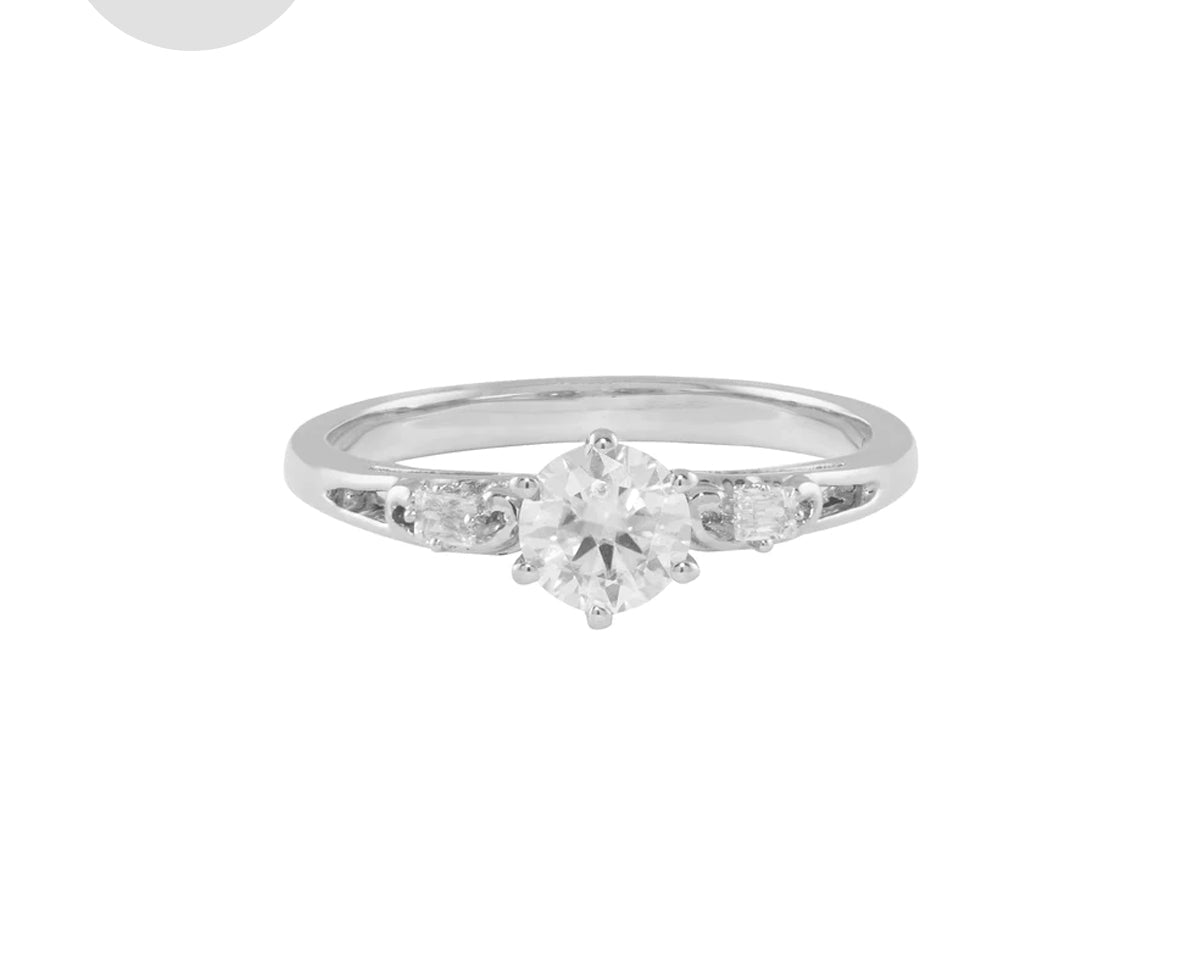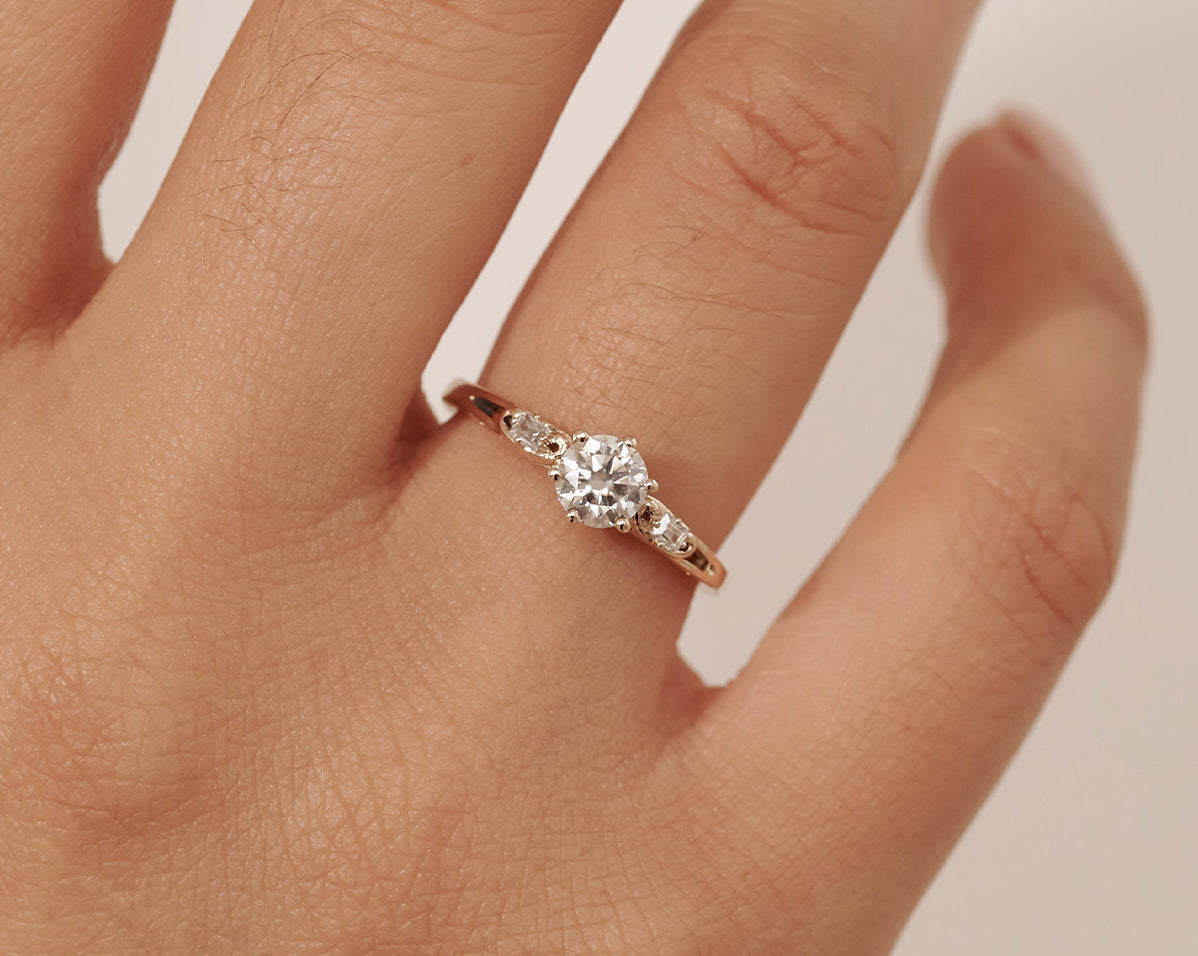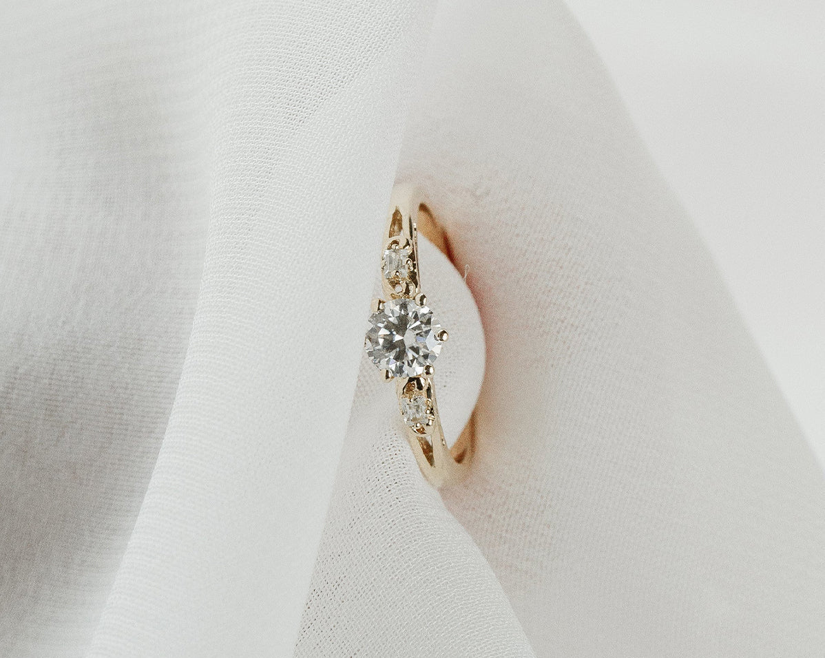 The classic Nightingale Solitaire Ring has a timeless round stone with two uniquely embedded gemstones adorned to either side for a vintage inspired finish.