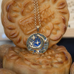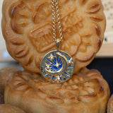 - Reversible necklace with a moon design on one side and a jumping rabbit design on the other